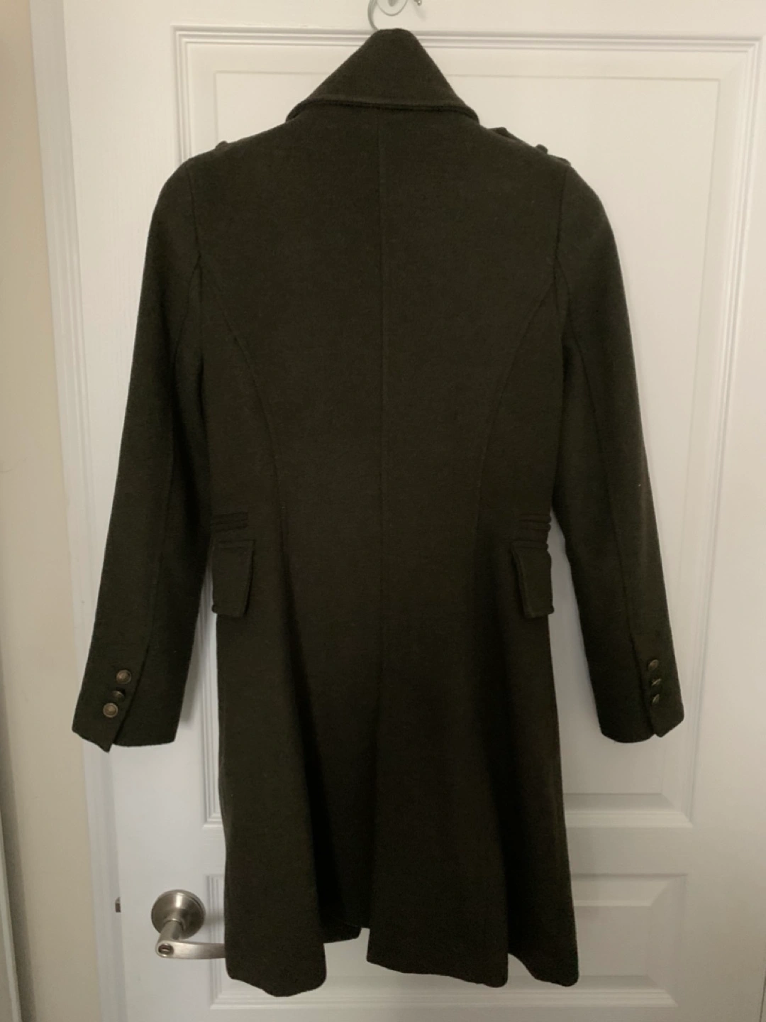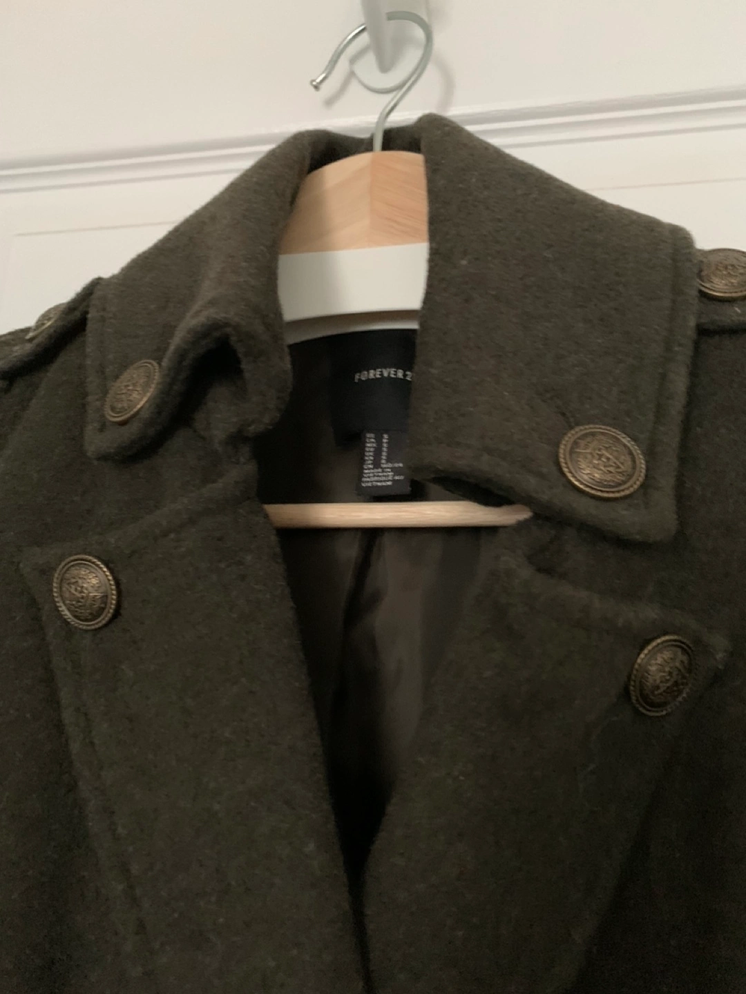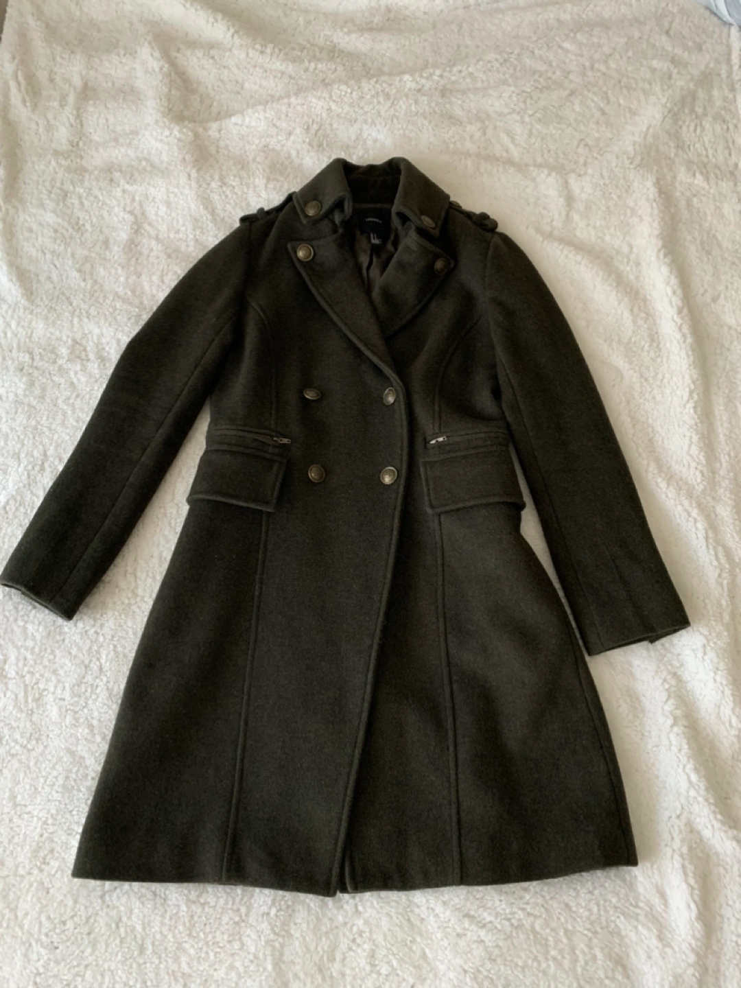 Double-breasted with gold bronze buttons. Features epaulets on shoulders. Pockets and zip details. Worn only once for photos!