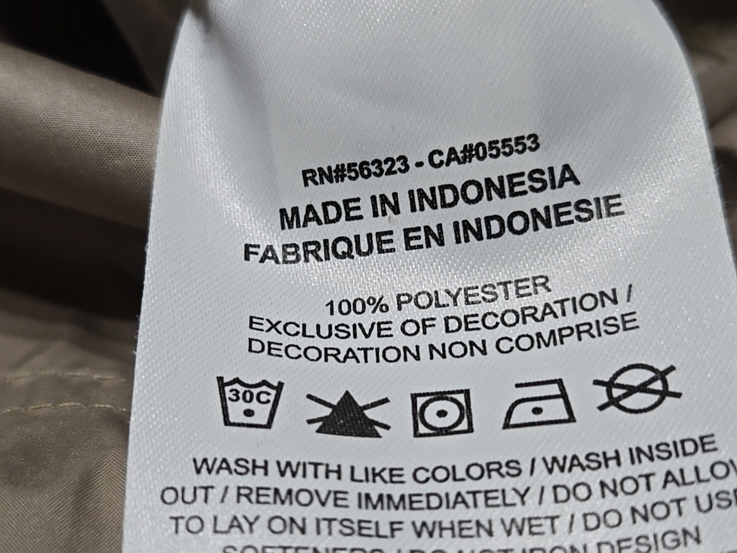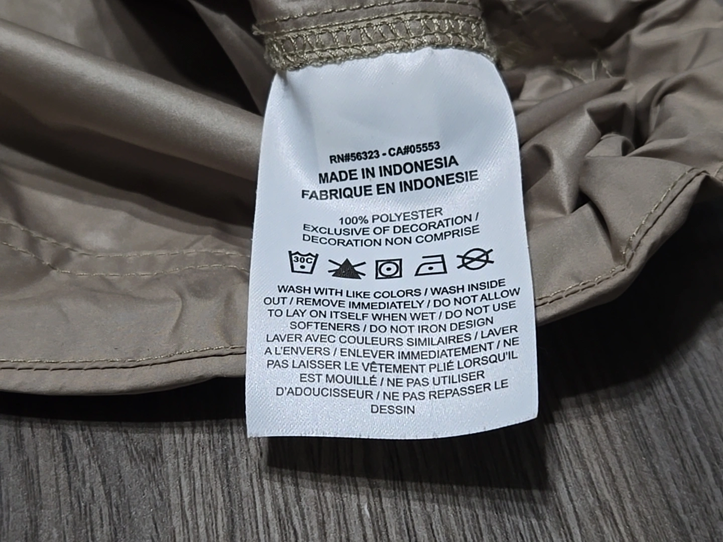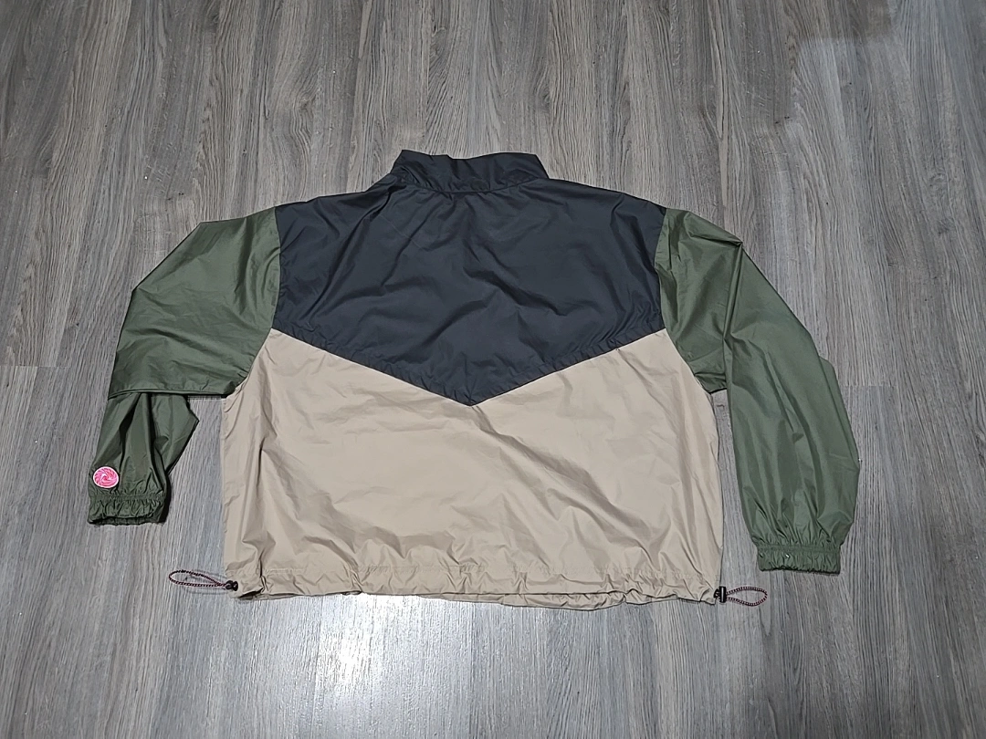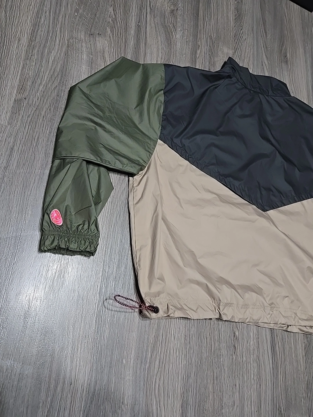 Lightweight windbreaker. Features a colour-blocked design in olive green, beige, and black. Has a half-zip closure and kangaroo pocket. Elasticated cuffs and hem. Small embroidered logo on sleeve.