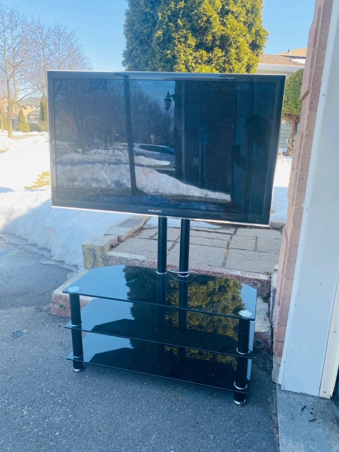 89Moving sale 32 inch Samsung TV on a black glass stand. Three shelves. Good condition.