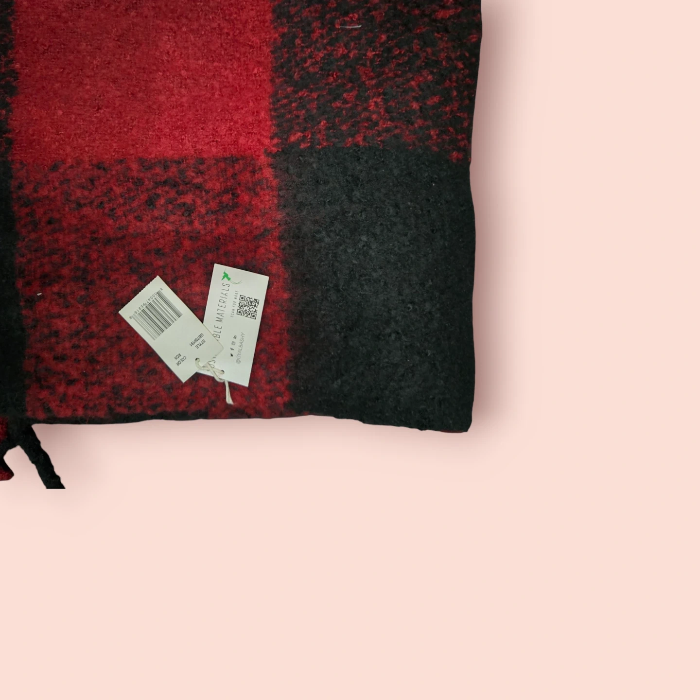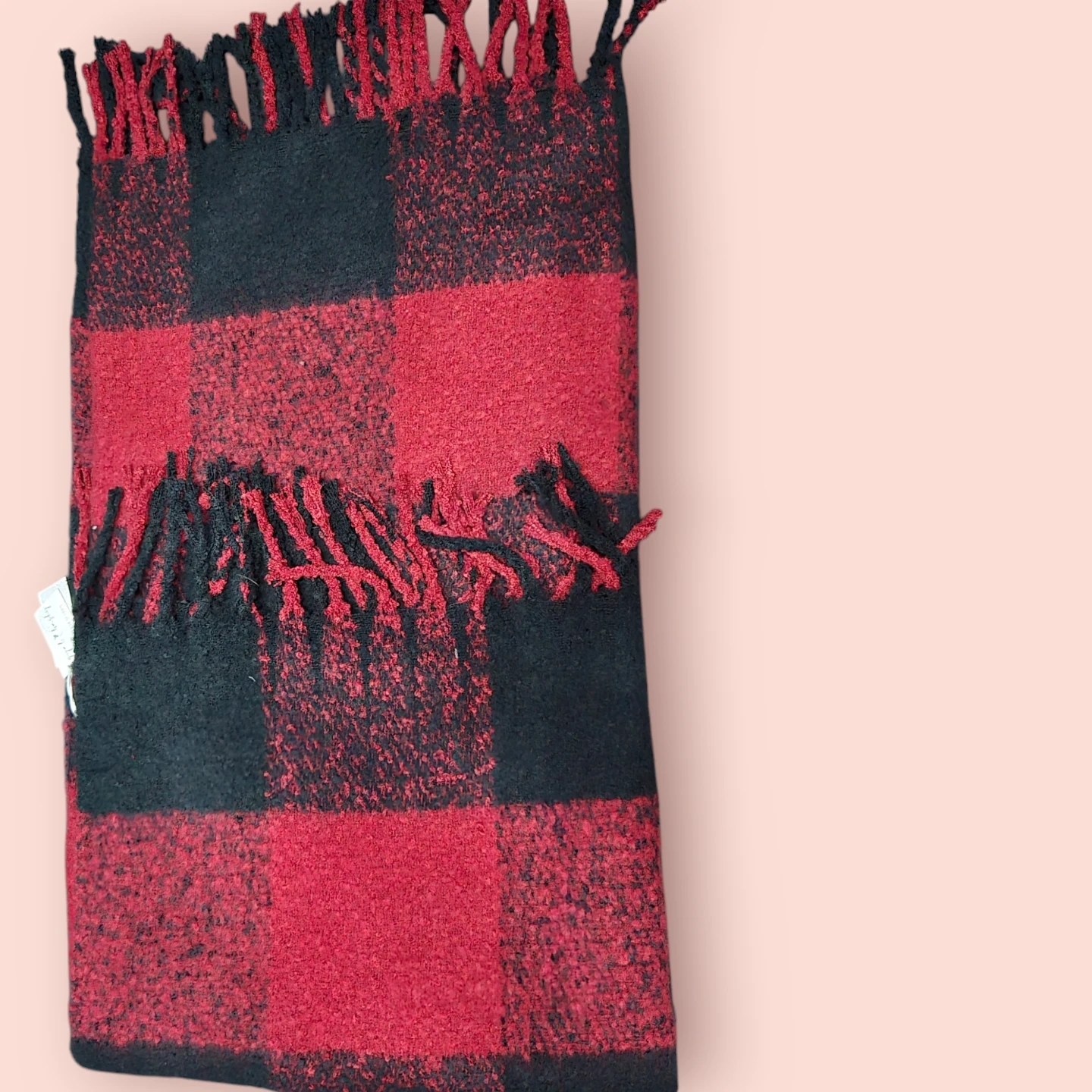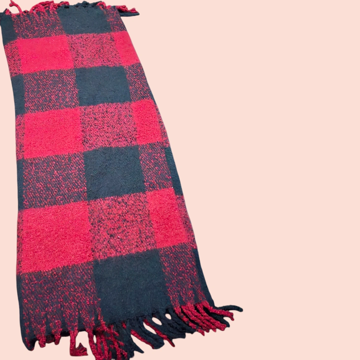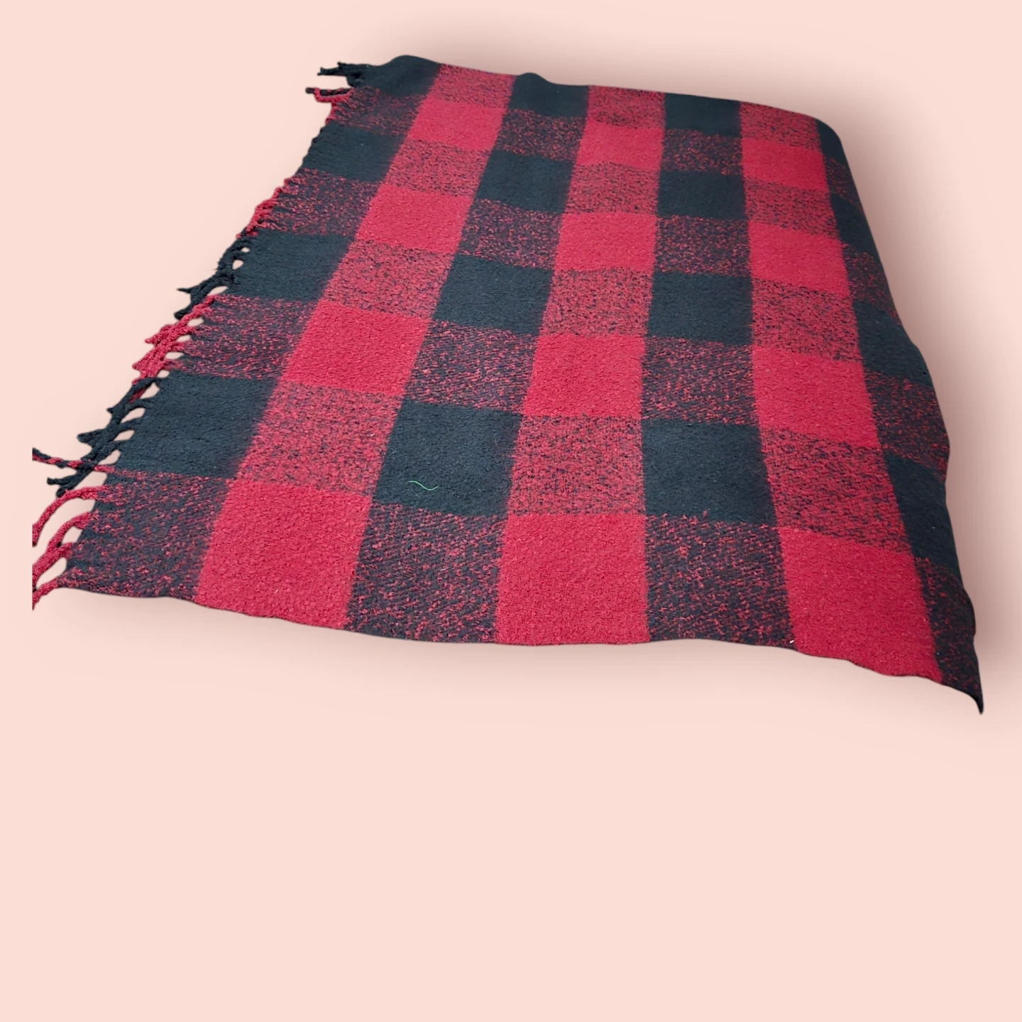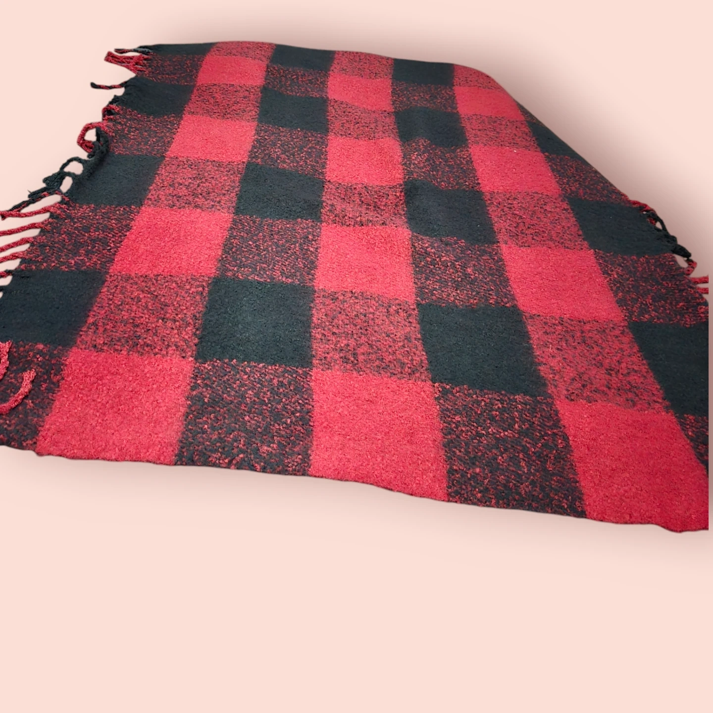 This is a cozy throw blanket with a classic red and black plaid pattern. It's perfect for adding a touch of warmth and style to your home. The blanket features fringed edges, adding to its charm and texture.