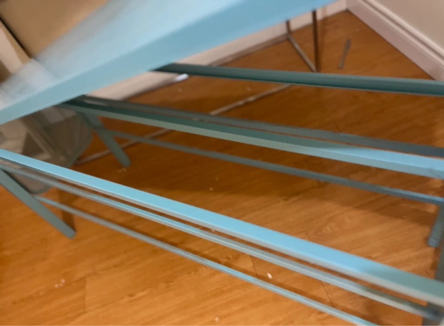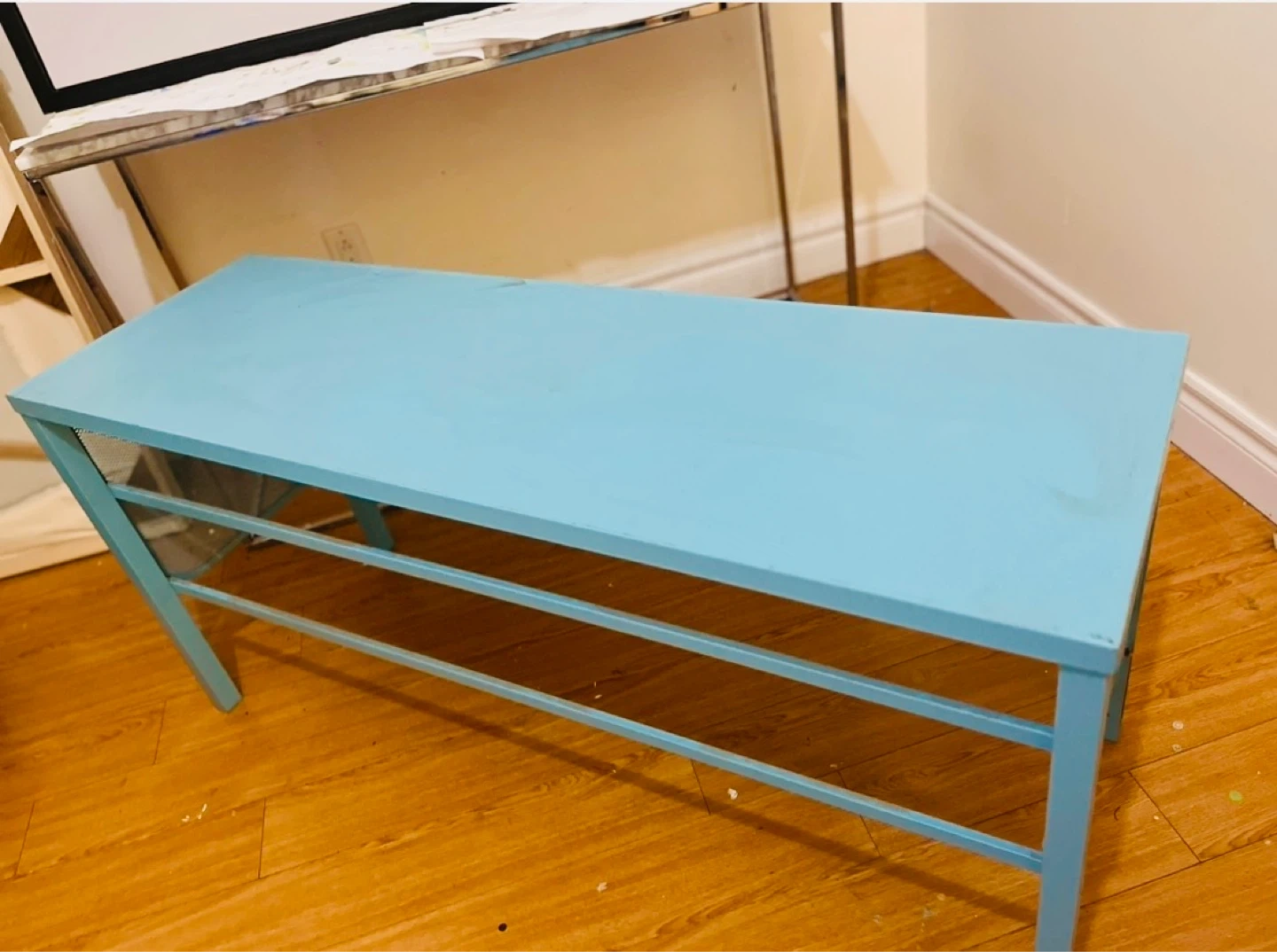 Fast pickup pls we are downsizing having just moved - This is a blue, two-tiered Ikea outdoor bench with a metal mesh sides. The bench is made of metal with a blue metal paint that is water & rust proof. Its dimensions are roughly 48 inches long and 16 inches high. The top can come off easily. Great for extra seating or display of outdoor plants etc