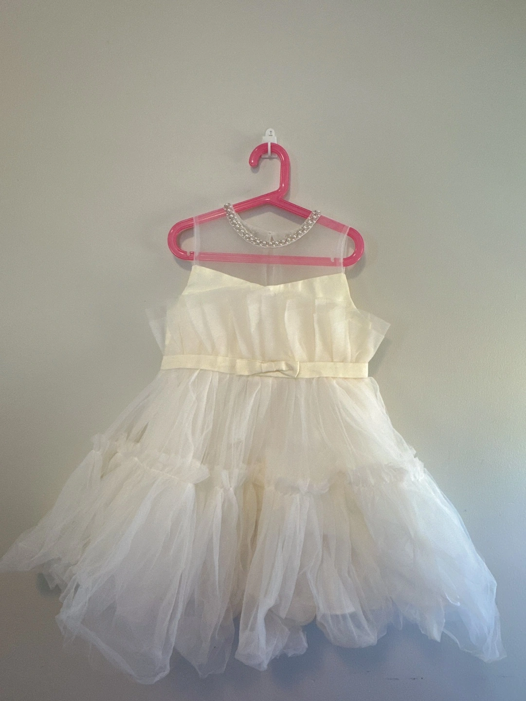 Cream-coloured sleeveless tulle dress. Features a layered tulle skirt and a sheer yoke adorned with faux pearls. Back zipper closure. Perfect for special occasions.