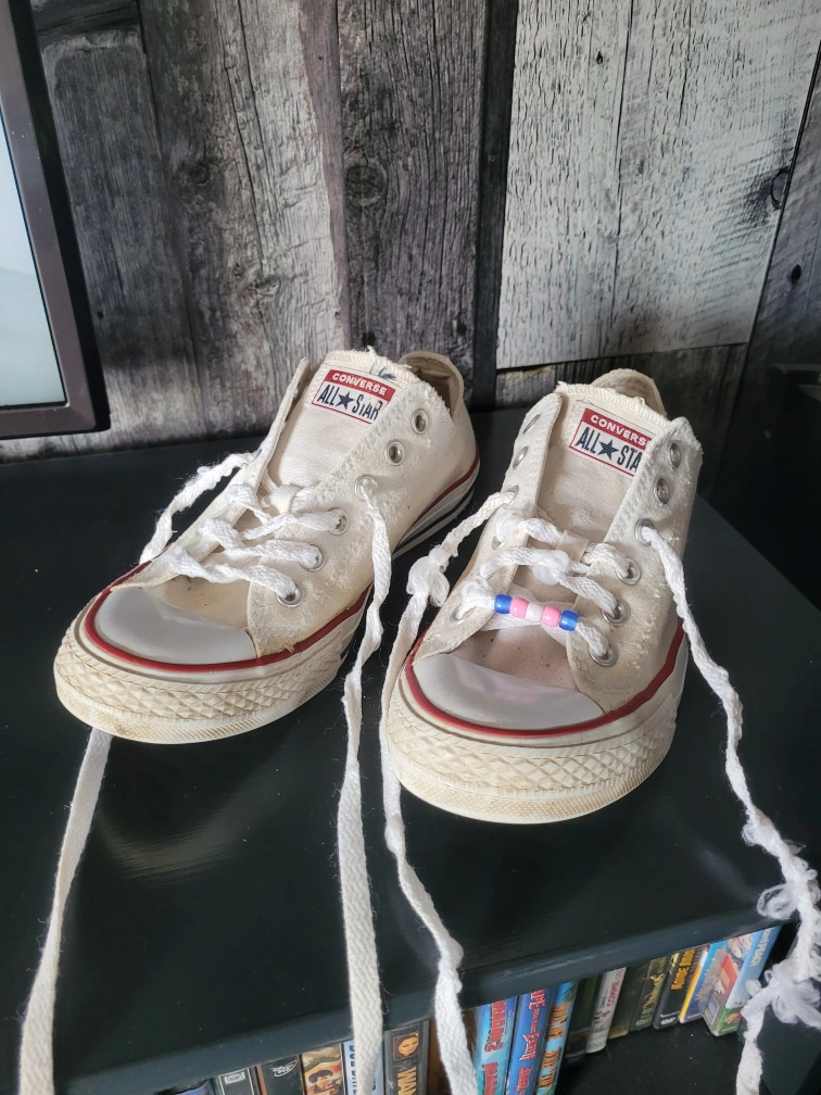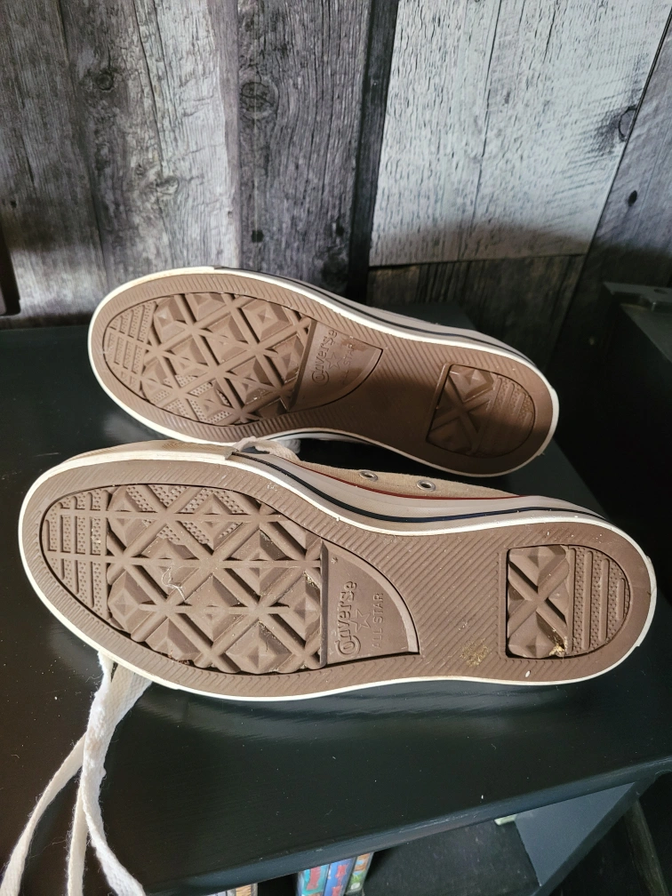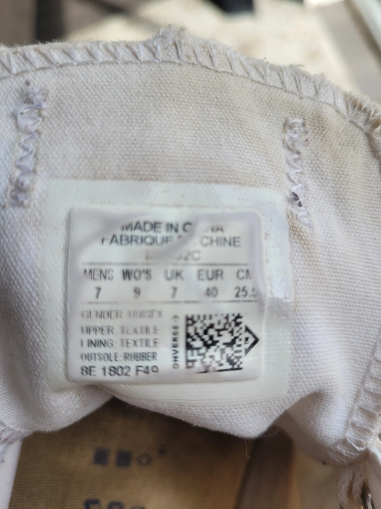 Pre-owned Converse All Star low top sneakers. Off-white canvas. Size 7 men's. womens size 9 .Minor wear and tear. Made in China.