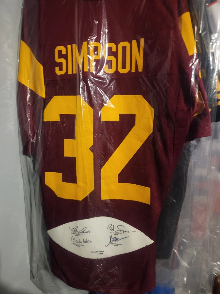 Rare autographed O.J. Simpson jersey. Number 32. USC Trojans. Special edition of 5000. Includes signatures of Mike Garrett, Charles White, and Marcus Allen.