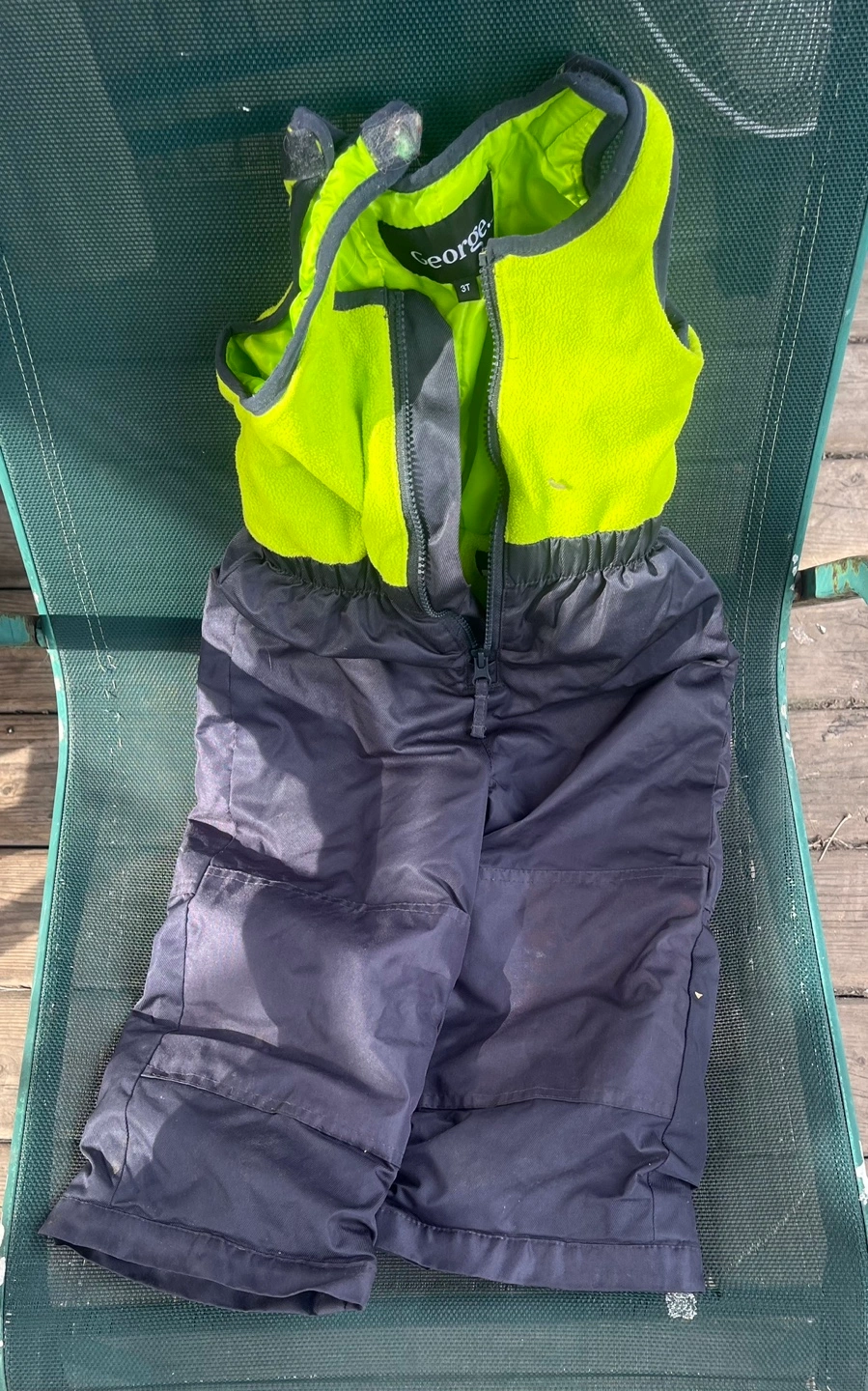 58Adorable snow pants. Lime green fleece top and dark grey water resistant bottom. Size 3T. Zipper closure.
