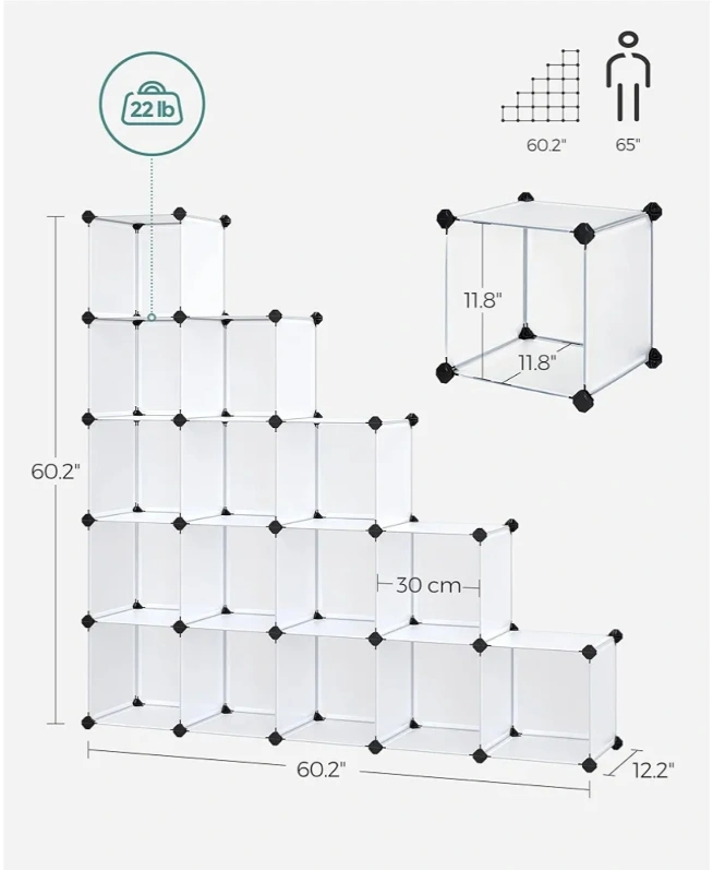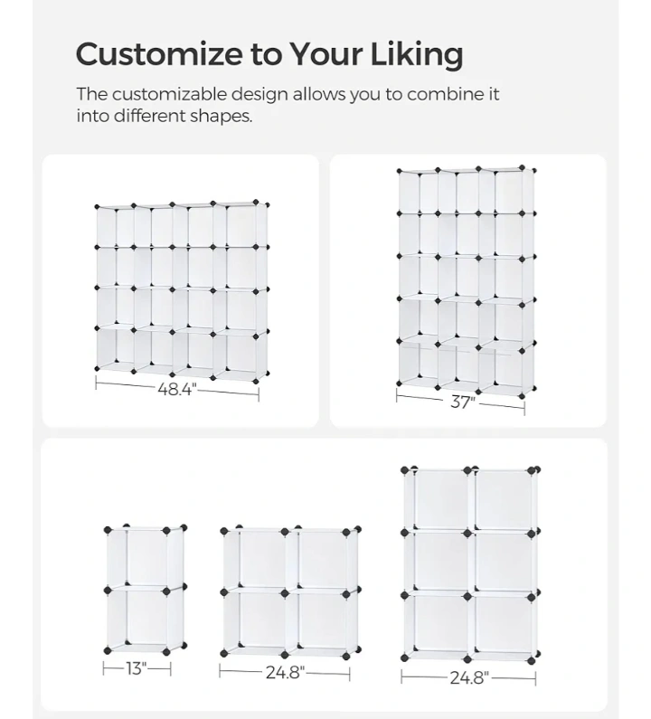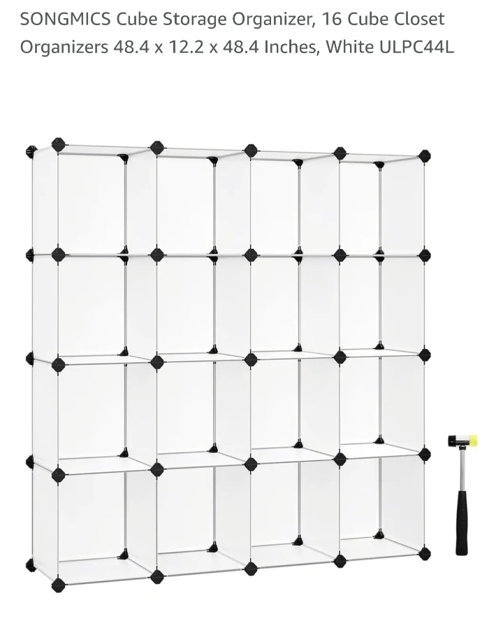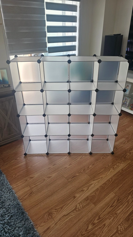 White plastic cube storage organizer. Sixteen cubes. Connectable design. Great for organization.
