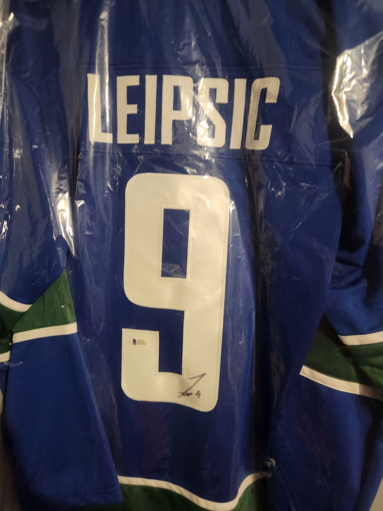 autographed Vancouver Canucks jerseys. feature player name and number. #9 Leipsic. come in plastic sleeves. these are shadow box jerse. no crest on other side just the #.