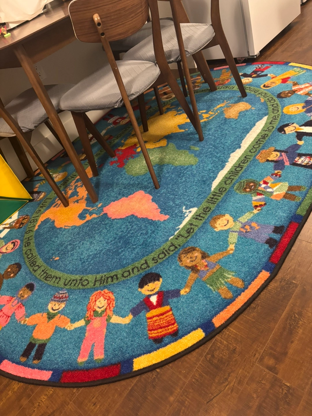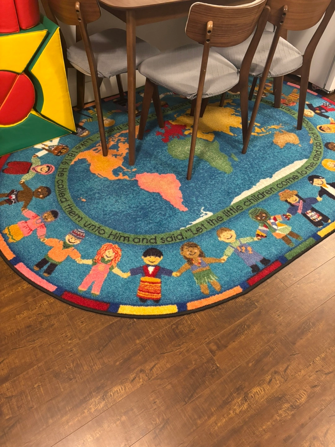 Round rug. Features a world map and children holding hands. Educational and colourful. Perfect for a classroom or playroom.