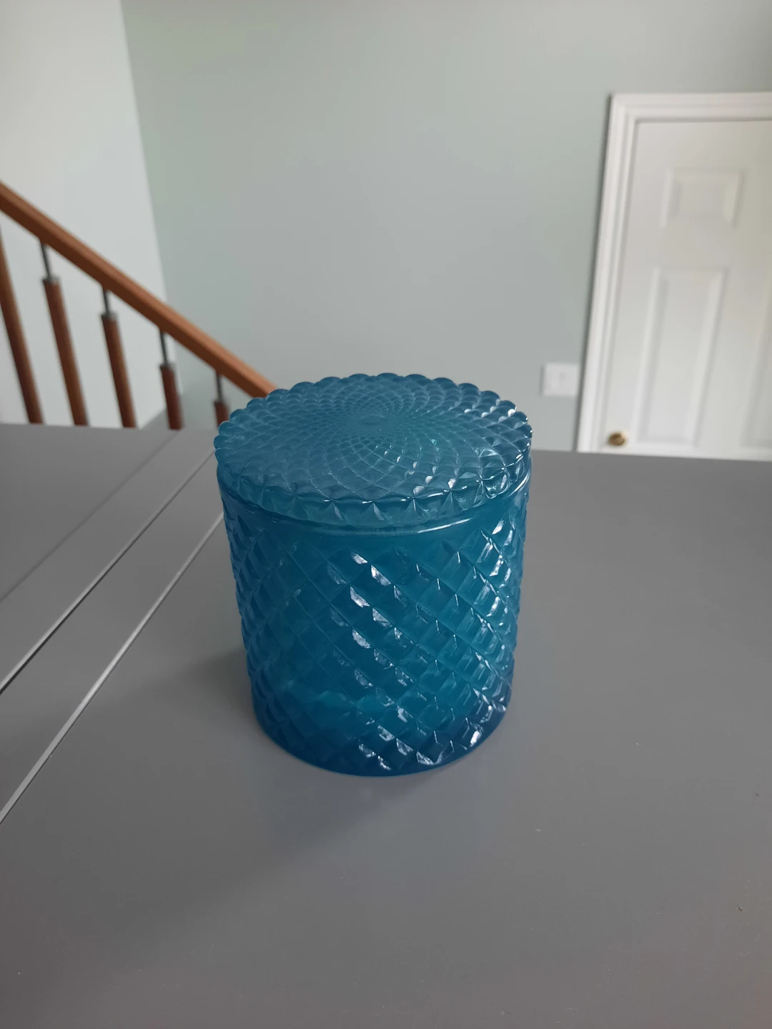 Hello stealth bargin hunter! This beautiful blue glass jar comes with a matching lid. It features a lovely diamond-patterned texture. It's great for storing small items or medium to large candle or as a decorative accent piece!