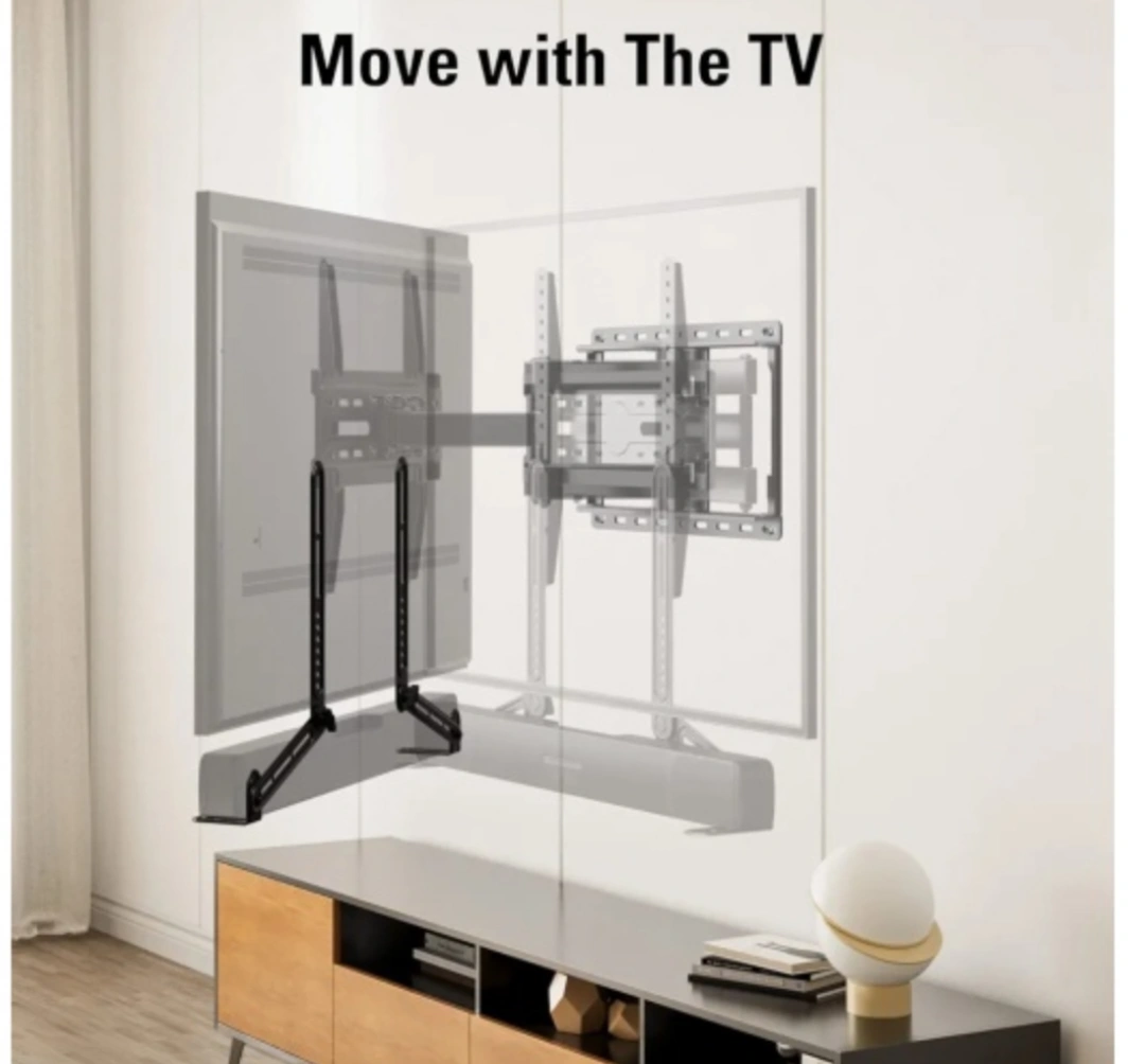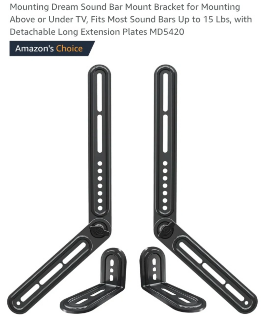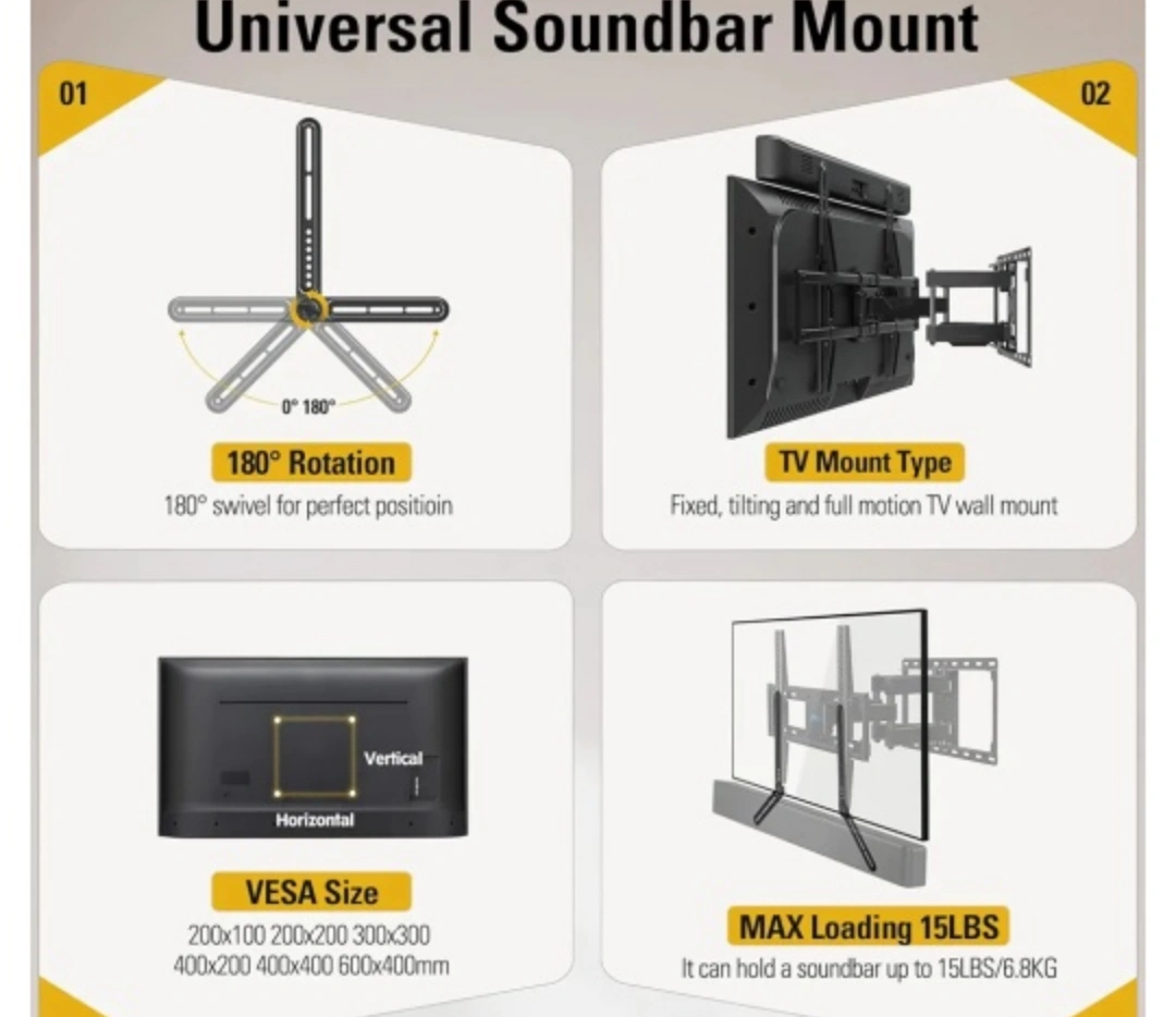 Universal soundbar mount. Fits most soundbars up to 15 lbs. 180° rotation. Works with various TV mounts. Includes long extension plates.