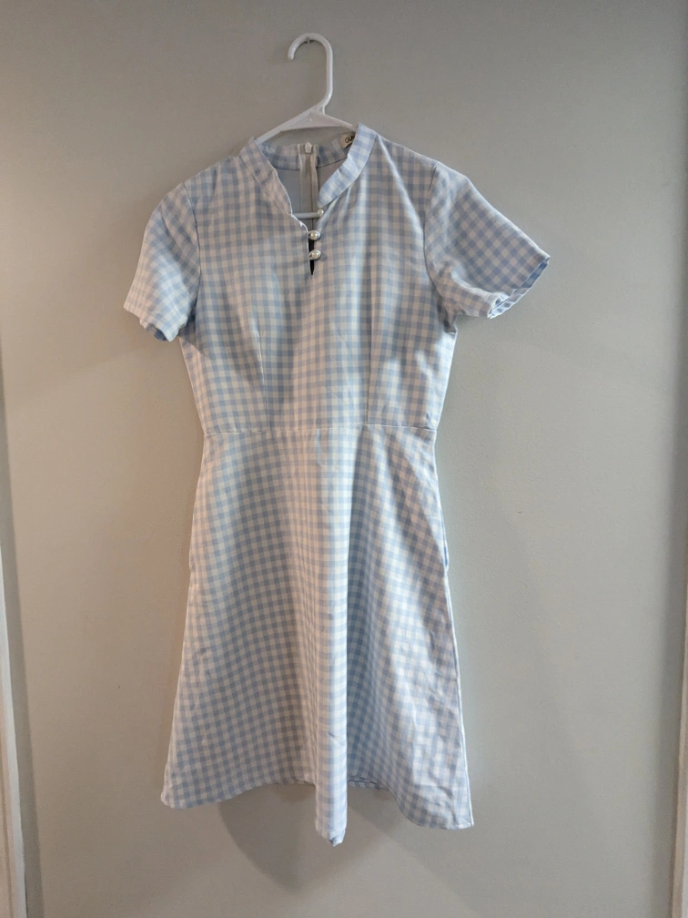 Adorable light blue gingham dress. Short sleeves, collared neckline. A-line silhouette. Button closure at neckline.