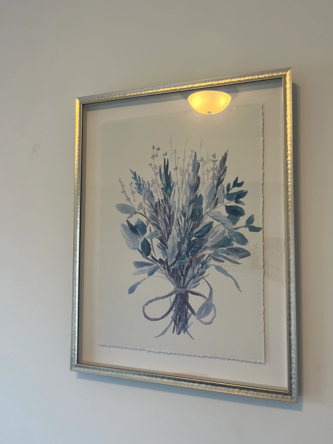 Beautiful framed watercolor print. Depicts a bouquet of lavender and other foliage. Silver coloured frame. Perfect addition to any home decor.