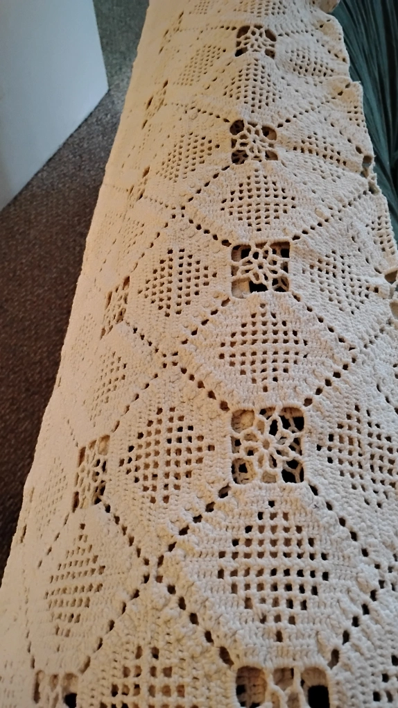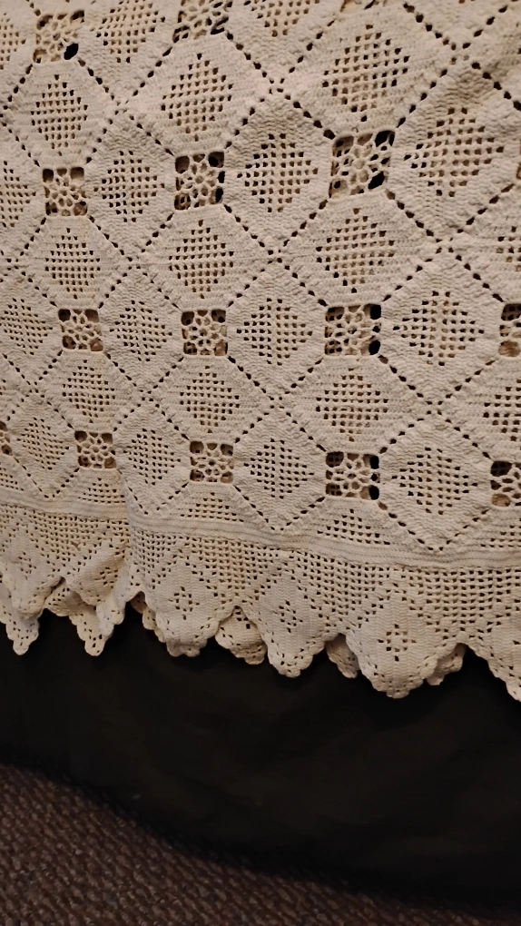 Beautiful Antique crocheted white Intricate diamond pattern. Scalloped edges. Adds a touch of vintage charm to any room king size Hand Made Excellent Condition