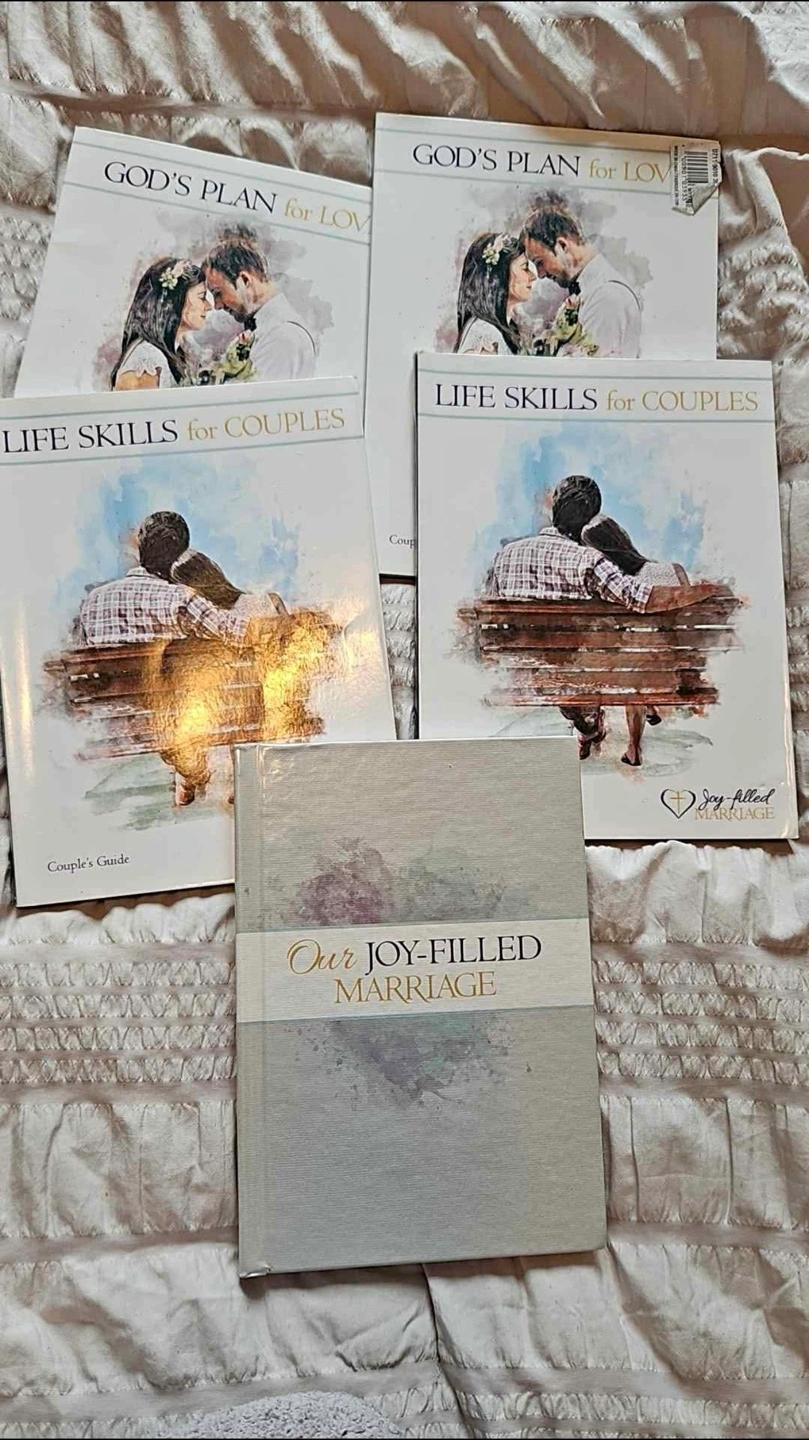 The ‘Joy Filled Couple Set’ contains the following: · 1 of "Our Joy Filled Marriage" Book · 2 of "Life Skills for Couples" Book · 2 of "God's Plan for Love" Book Lightly used and answered are erased with white out.
