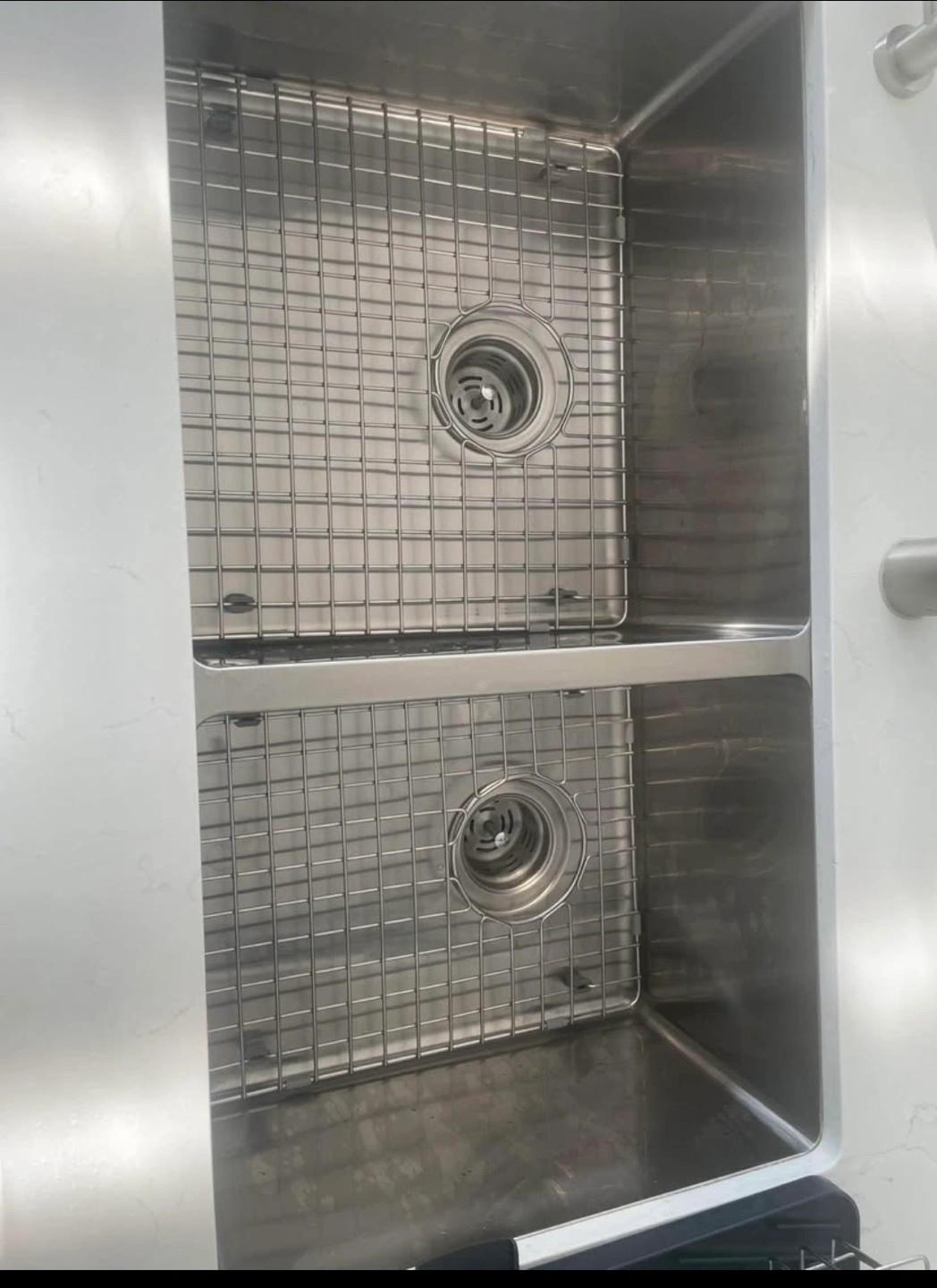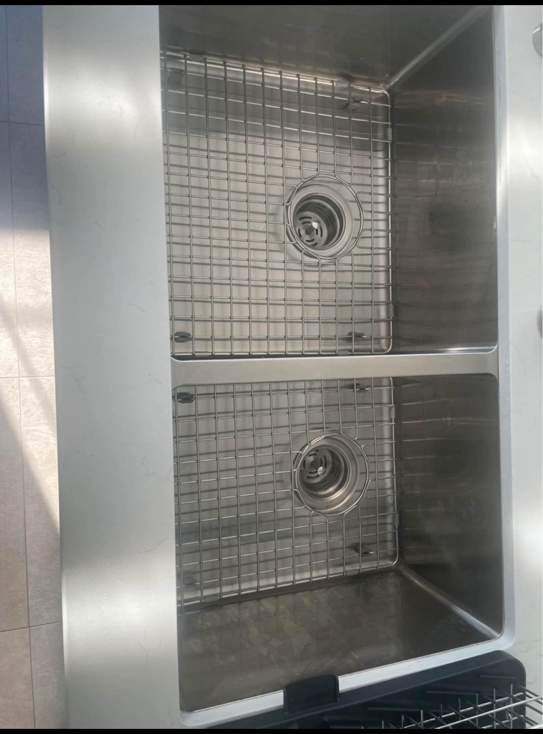 Stainless steel double kitchen sink. Model 20332L. Includes two wire racks. Rear positioned drain holes. 33" x 18" x 10" outside dimensions. Minimum cabinet size 36".
