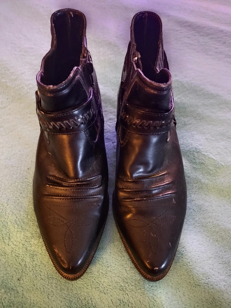 Pair of short, dark brown, leather ankle boots. Western style with a zipper closure. Some slight wear and the zippers are a little stiff from not being worn in a few years. Size 7. Cash only. Meet at Bridlewood Mall but willing to meet elsewhere if you buy multiple items.