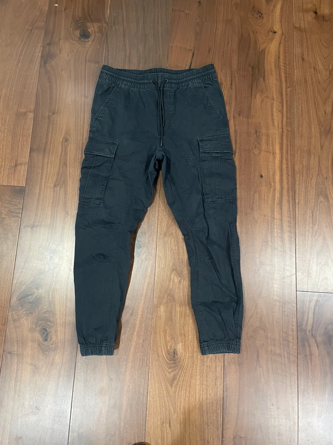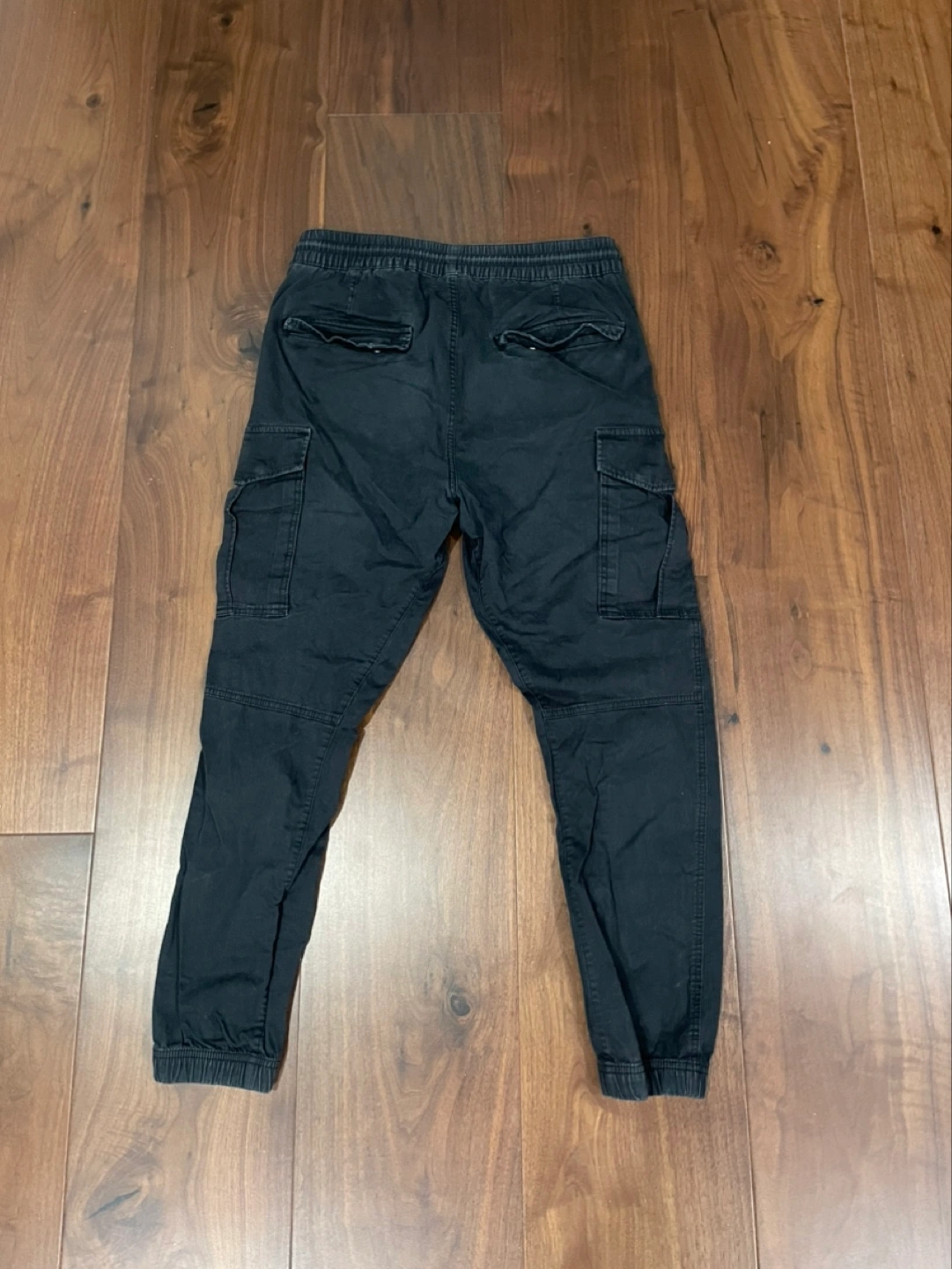 Men's black cargo pants. Slim fit. Elastic waistband and cuffs. Multiple pockets. Size Medium
