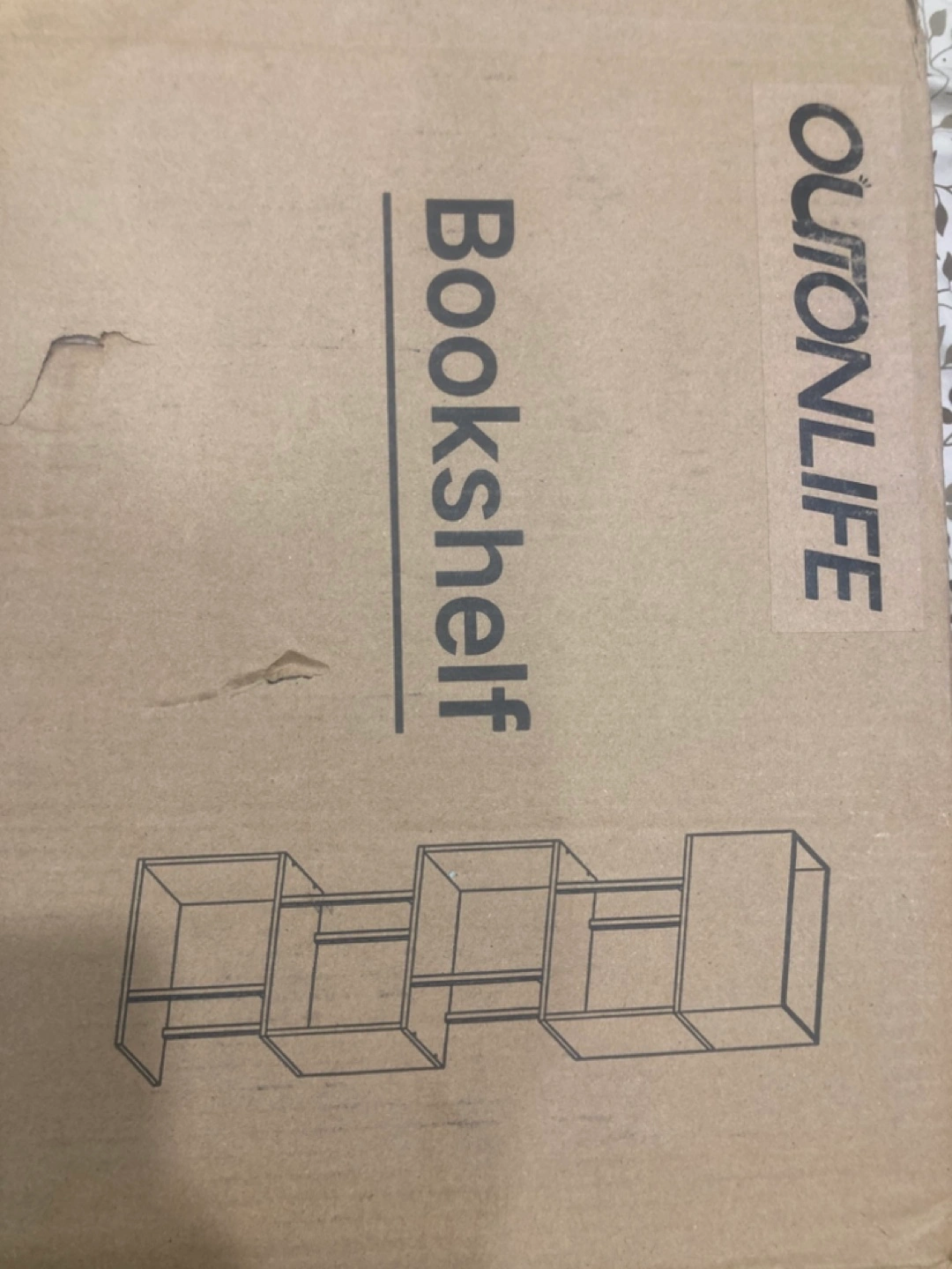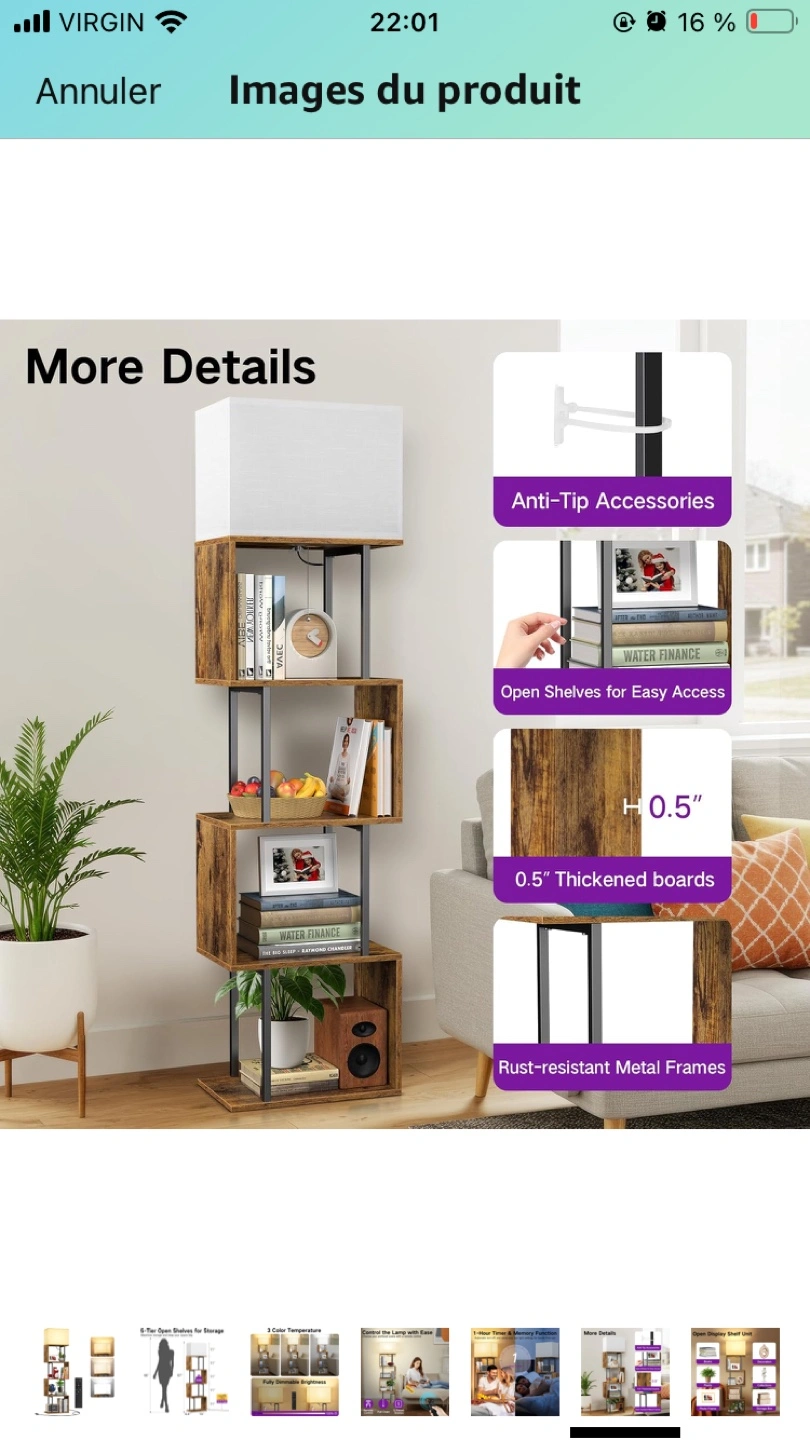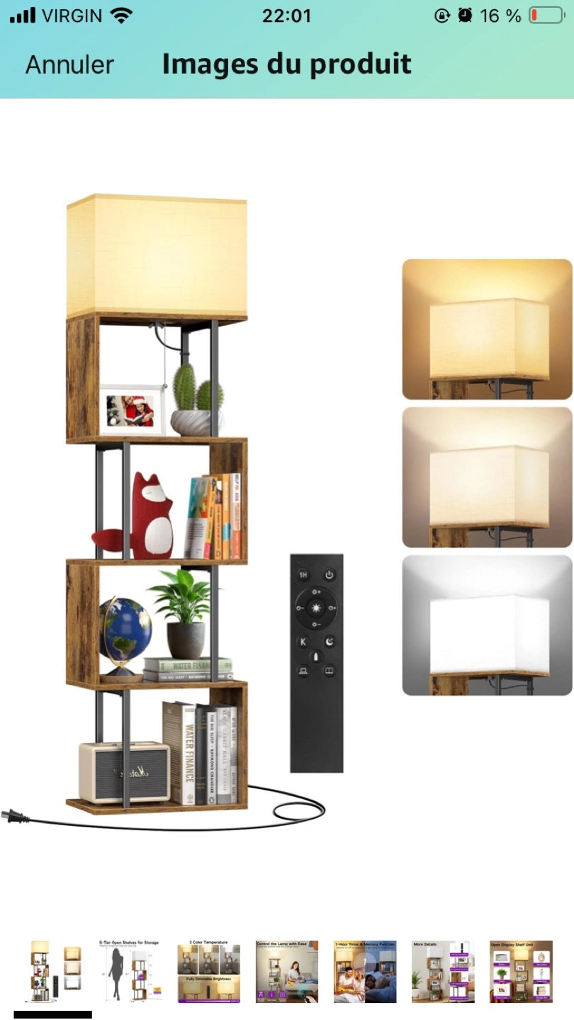 Rustic brown and black floor lamp with five open shelves. Metal frame. Includes remote control. Great for storage and ambient lighting. Brand new, still in box