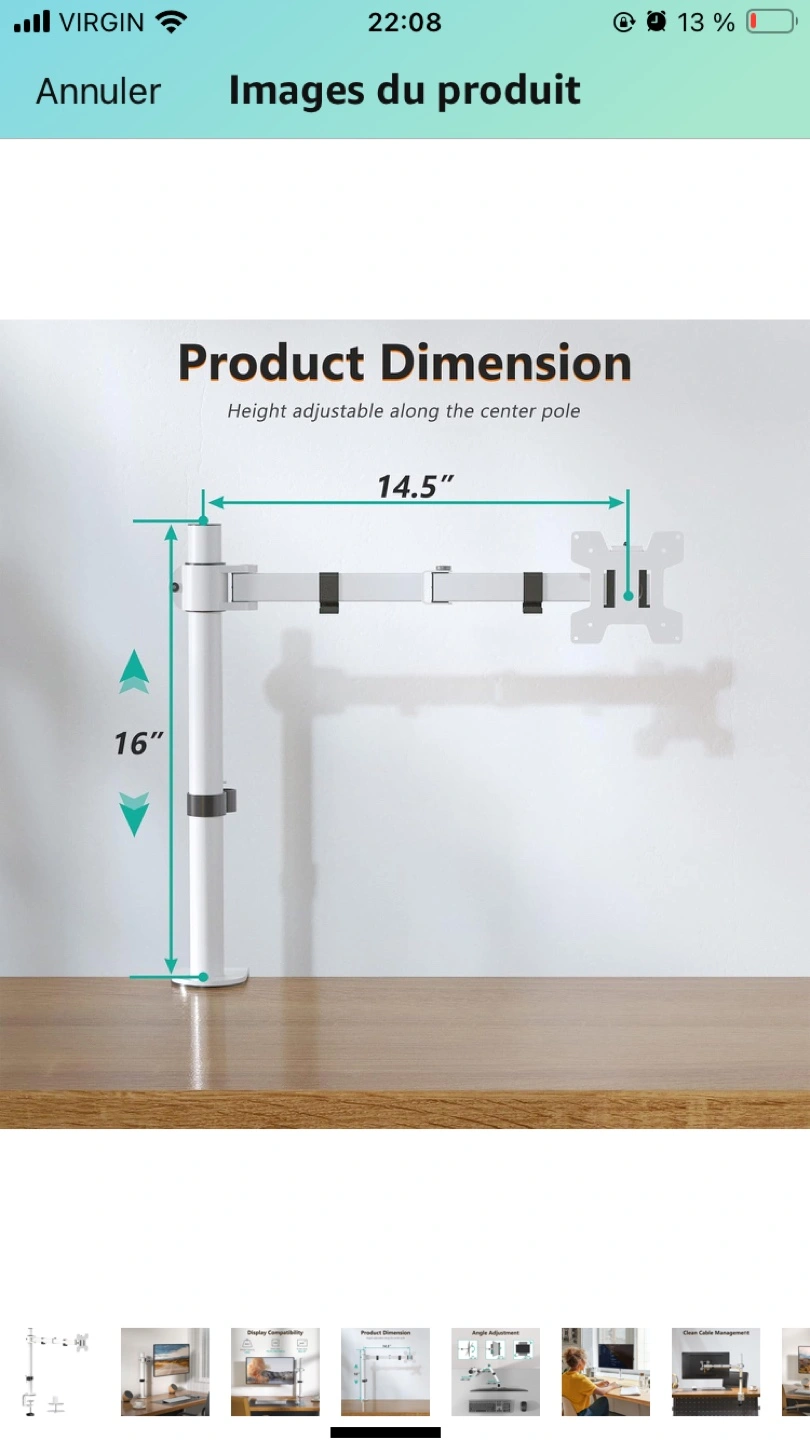 Adjustable single monitor desk mount. Supports screens up to 32 inches . Features cable management. Height adjustable. Includes all mounting hardware. Brand new