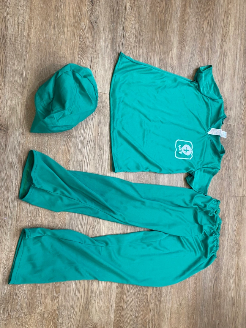 Green scrub costume. Says vet on it but my kids used it as a doctor set for dress up. Includes top, pants, and scrub cap (never used). Size large but fits like a kids medium (age 8-10 depending on child’s size) Polyester. Machine washable. Perfect for dress up and imaginative play or for Halloween.