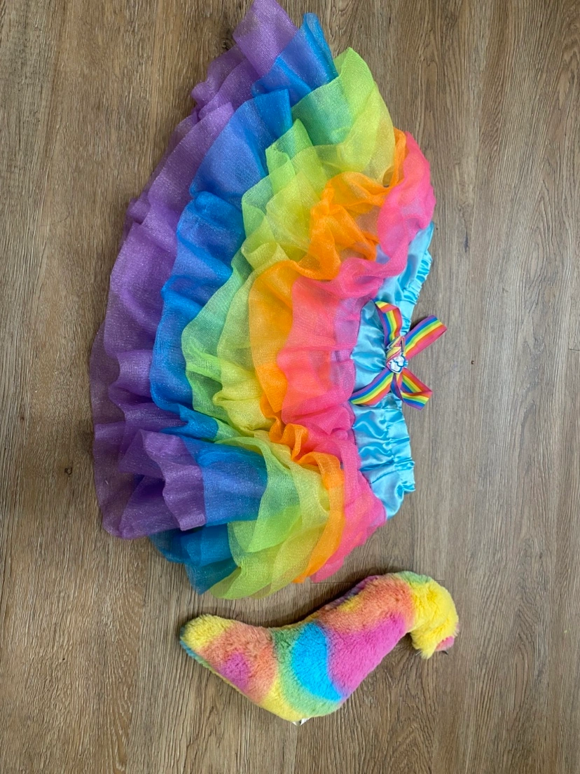 Rainbow layered tulle tutu. Matching rainbow tail. Great for dress-up or parties.