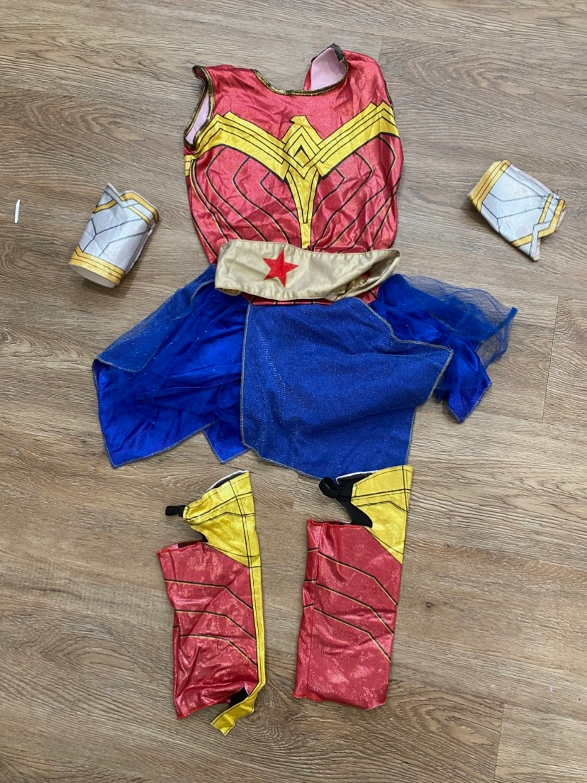 Wonder Woman costume. Includes top, skirt, wrist cuffs, and boot tops. Great for Halloween or dress-up. This is a well loved piece from our dress up bin with lots of life still left to it. I would say it is good for ages 7-9 depending on your child’s size. Please refer to picture for details and condition of use.