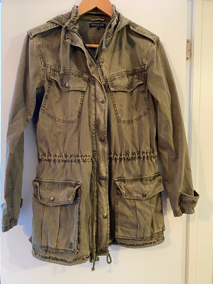 Aritzia trooper hooded jacket. Olive green. XXS size. Zip and button closure. Multiple pockets. Good condition, please refer to pictures for details and condition of use. Perfect for layering or as a light jacket for the mild days in spring or fall weather.