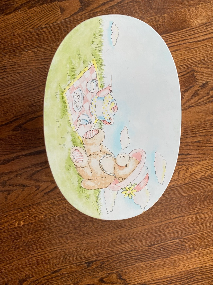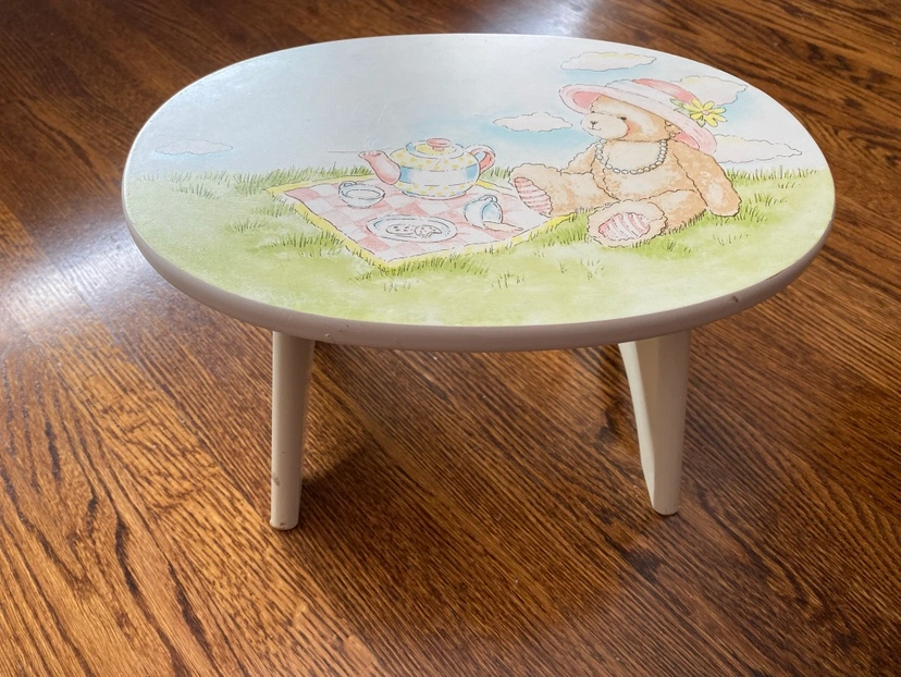 Small wooden stool. Oval top. Features a charming hand-painted design of a teddy bear enjoying a picnic. Three short legs. Ideal for children's standing or sitting use, play or décor. Was used as a stool in the entry to sit on when putting on boots or shoes. Shows use. Please refer to pictures for details and condition.