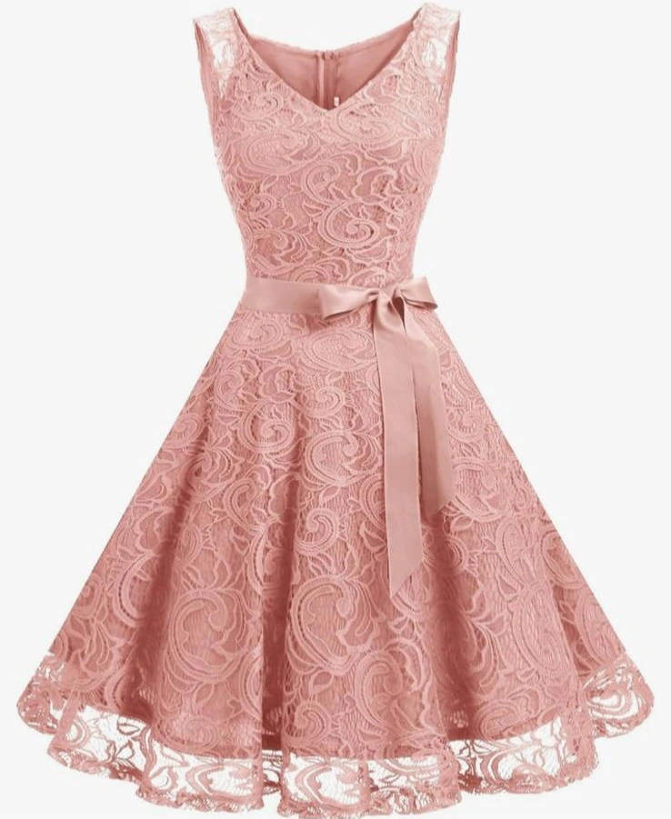 Beautiful dusty rose lace dress. Features a v-neck, sleeveless design, and a fitted bodice. A-line skirt with a satin ribbon at the waist. Perfect for a special occasion.