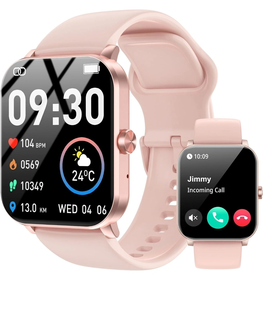 Pink smartwatch. Features Bluetooth calling, voice assistant, and 120+ sport modes. Tracks steps, calories burned, heart rate, blood oxygen, and sleep. Long battery life; up to 30 days standby time. Includes charging cable.
