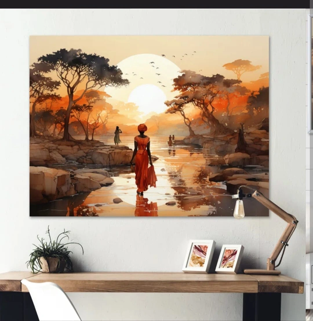 Large format canvas print. Beautiful watercolour style artwork. Depicts an African woman walking along a river at sunset. Stunning colours and detail. Perfect for home decor.