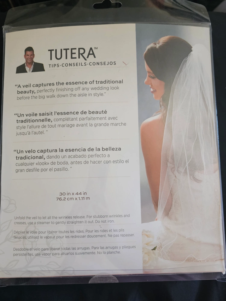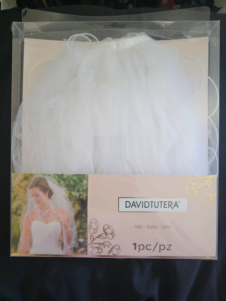 New bridal veil. White, packaged. Measures 30 x 44 inches. Care instructions included.