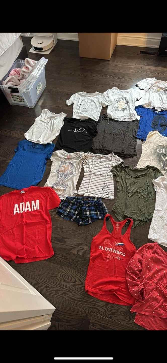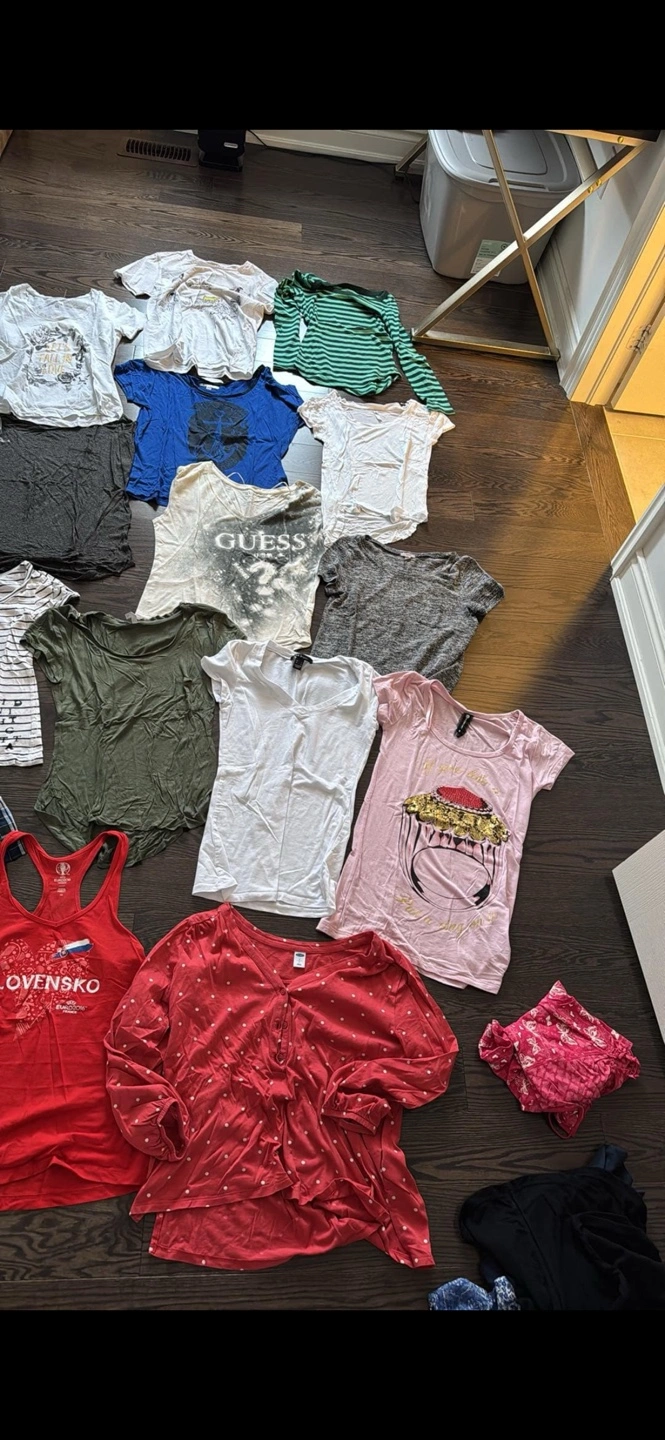 Large bundle of women's clothing. Includes various tops, t-shirts, tank tops, and a long-sleeved shirt. Assorted colours and patterns. Sizes fit an xs