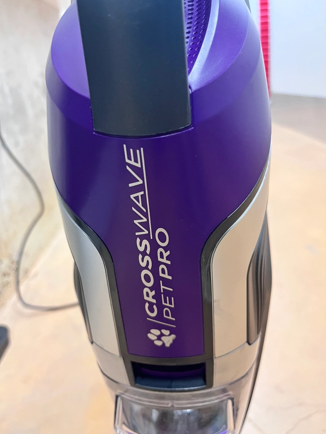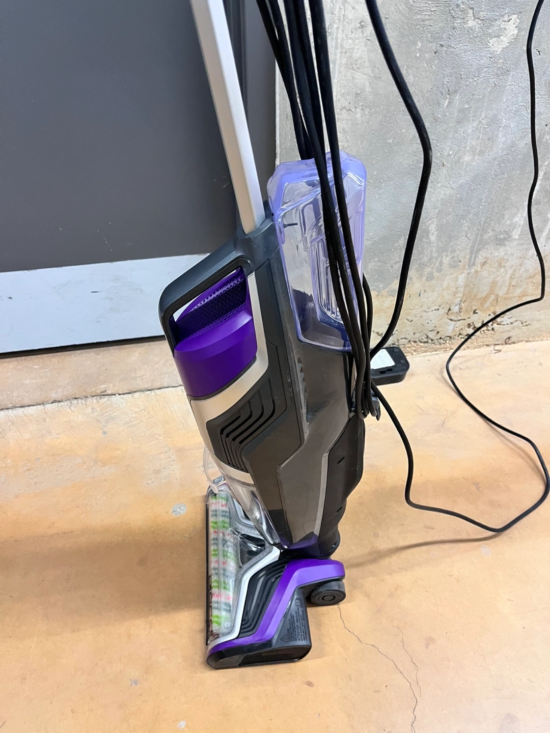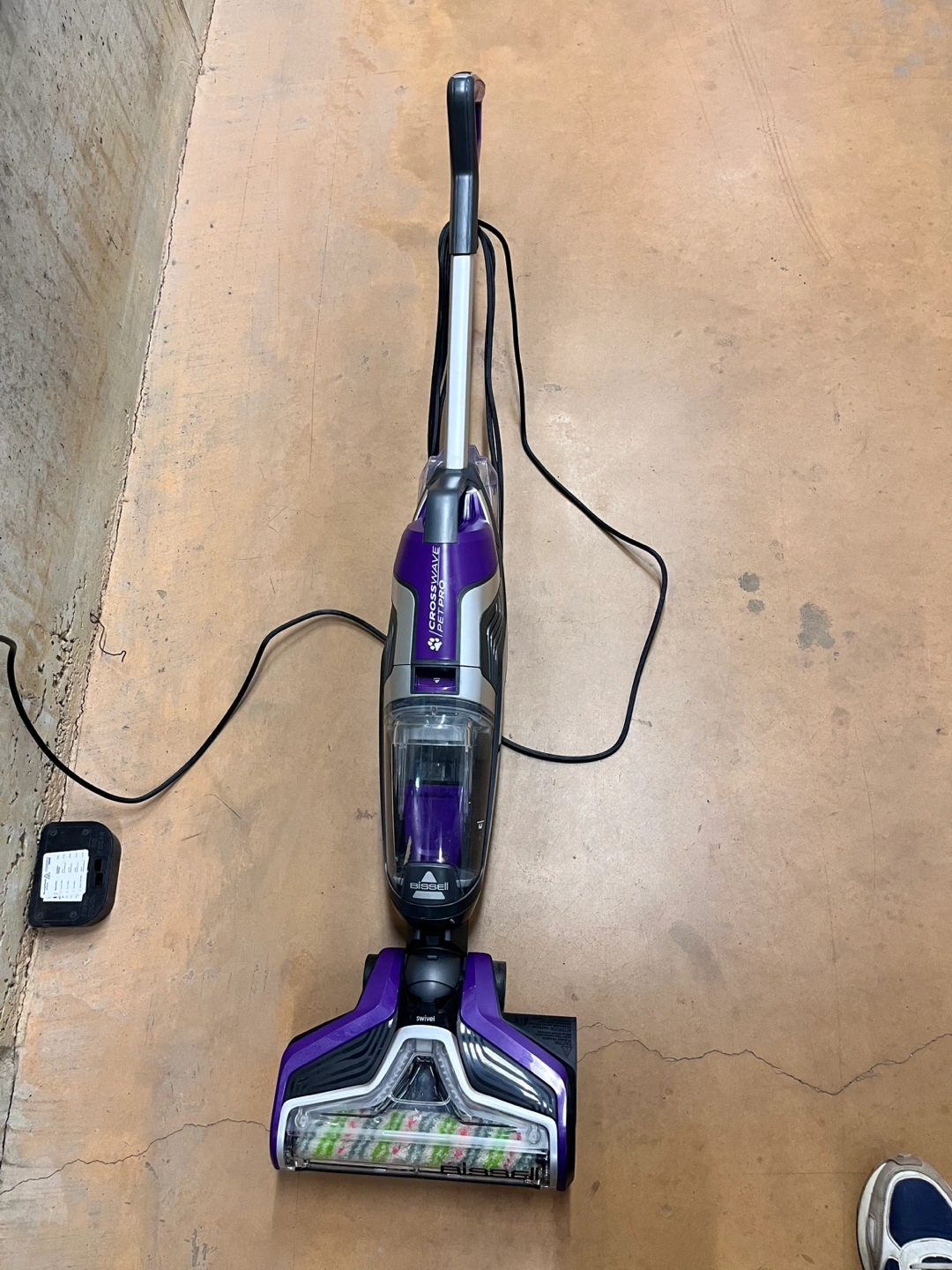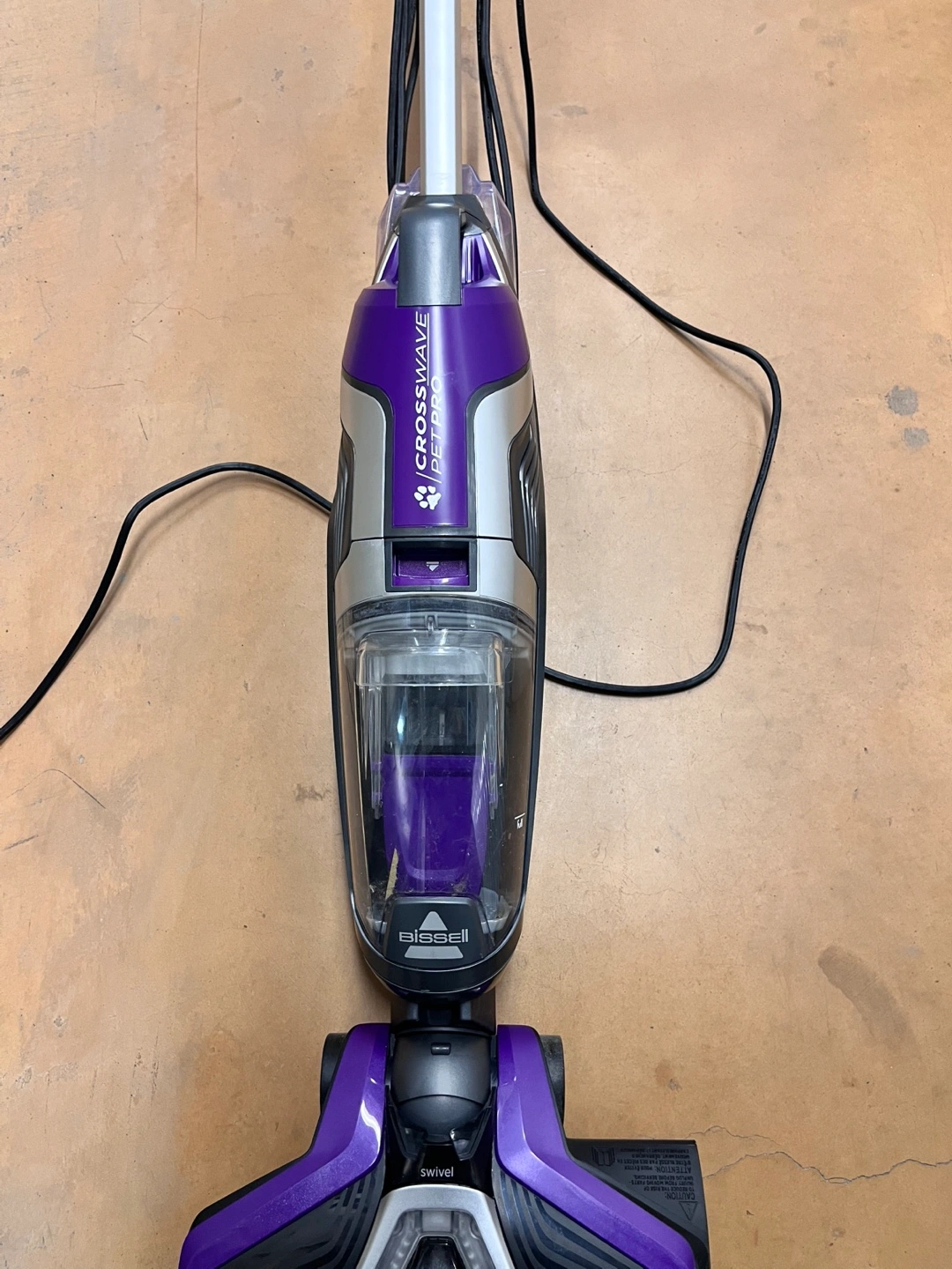 Purple and silver Bissell CrossWave Pet Pro vacuum. Swivel steering. Cordless and lightweight. Good for pet hair.