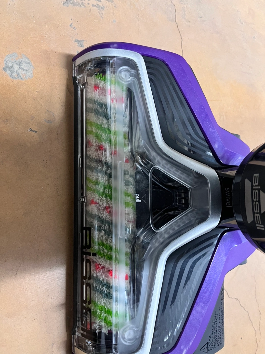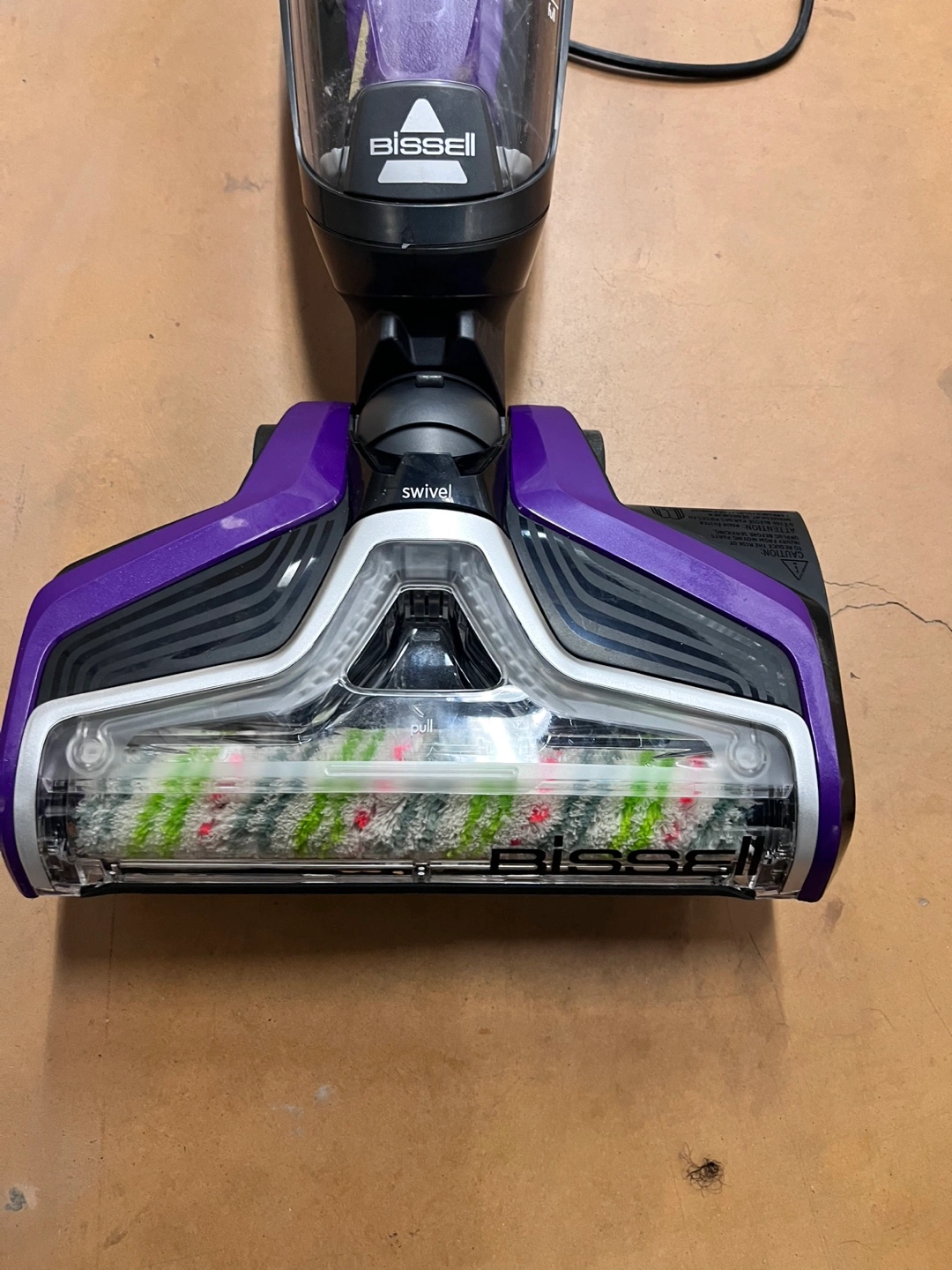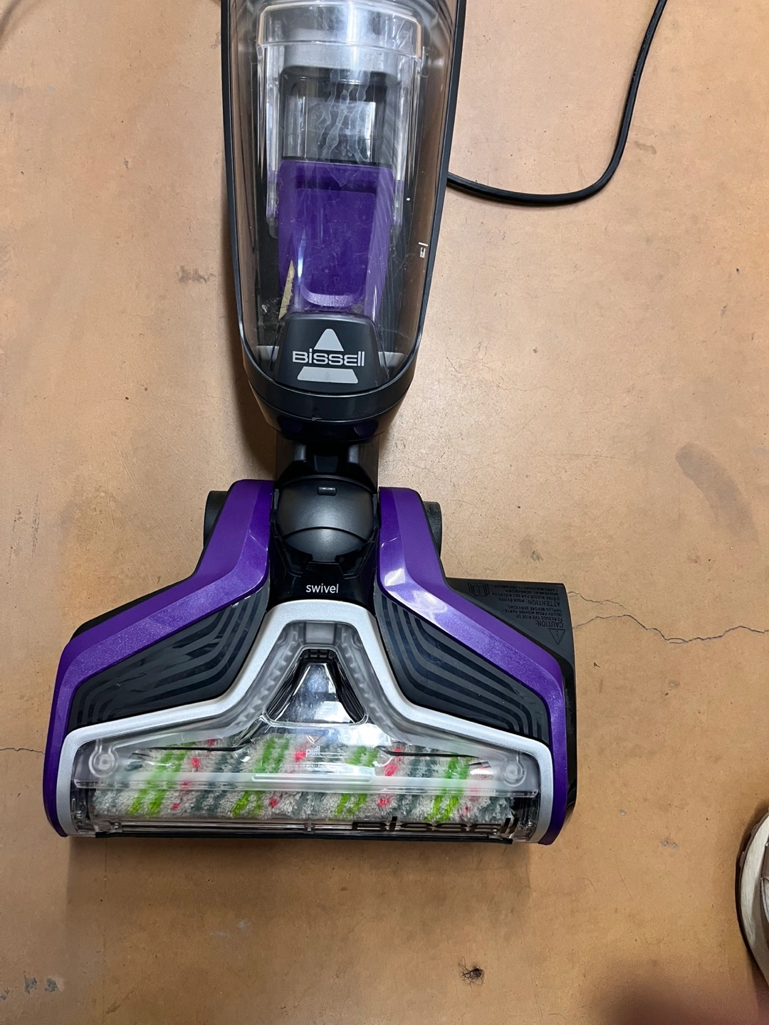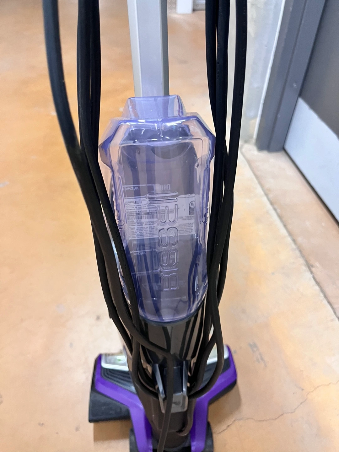 Purple and silver Bissell CrossWave Pet Pro vacuum. Swivel steering. Cordless and lightweight. Good for pet hair.