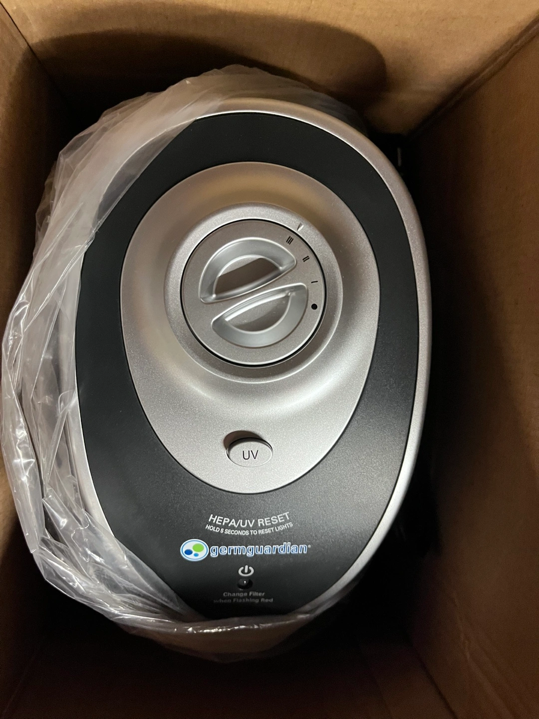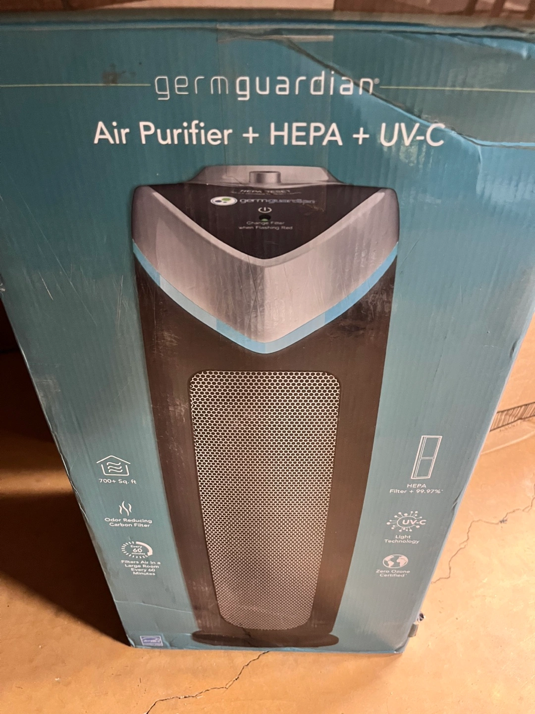106New in box GermGuardian air purifier. HEPA and UV-C technology. Covers 700+ sq ft. Odor-reducing carbon filter. Change filter when flashing red.