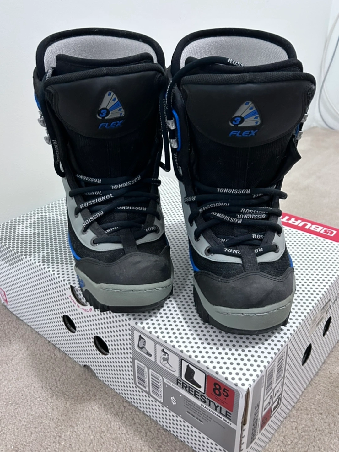 Pair of used Rossignol Freestyle 85 snowboard boots. Size 8.5. Black, grey, and blue. Good condition. Sold with original box.