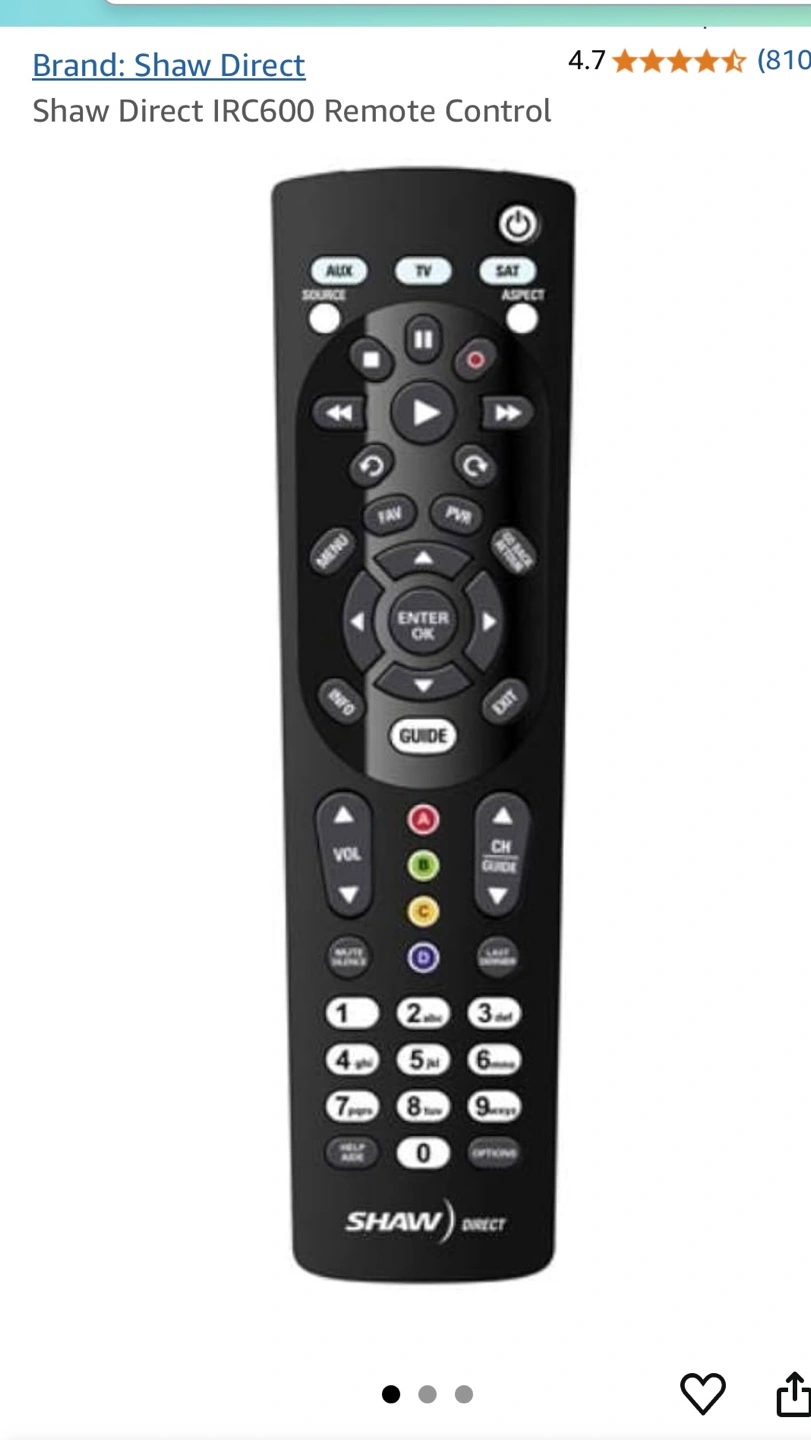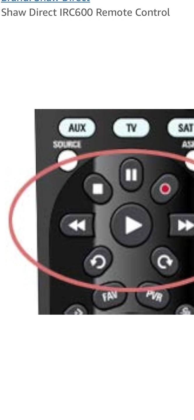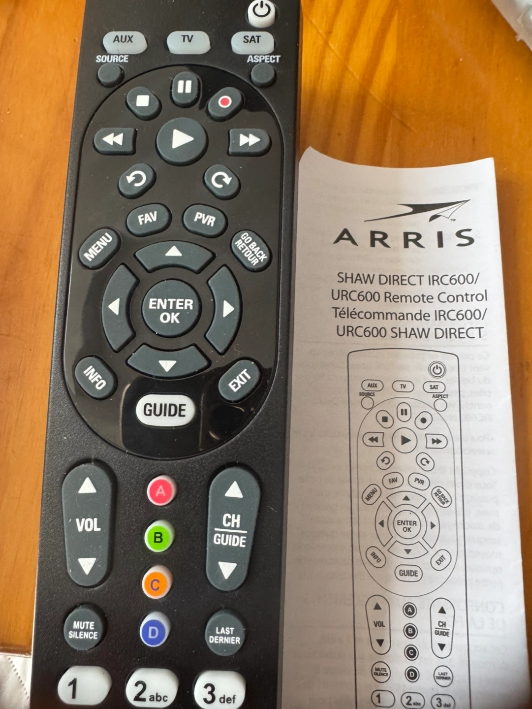 Used Shaw Direct IRC600 remote. Includes instruction booklet. Black plastic. Standard buttons. Good working condition. Brand Shaw Direct Special feature pre_programmed, Infrared Colour Black Max number of supported devices 1 Compatible devices Television Connectivity technology Infrared Remote works with all models of Shaw Direct receivers. However because of its UHF capabilities it works best with the high end model receivers 605, 630 and 830.