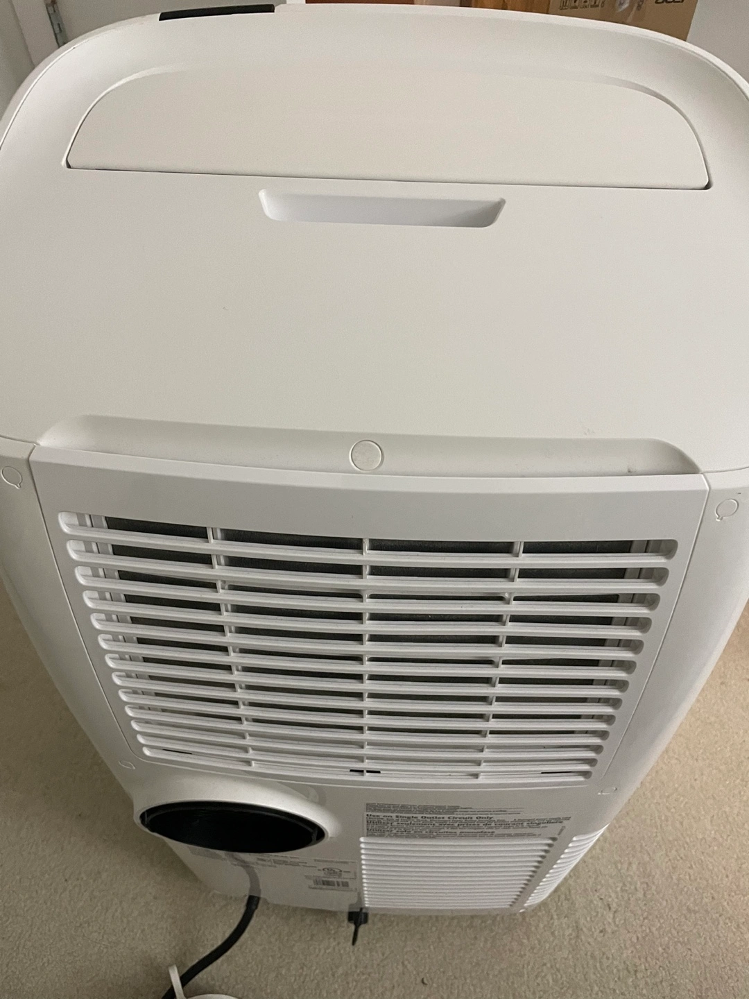 Portable air conditioner. White with grey accents. Includes exhaust hose. Looks 12000BTU De'Longhi Pinguino Portable Air Conditioner