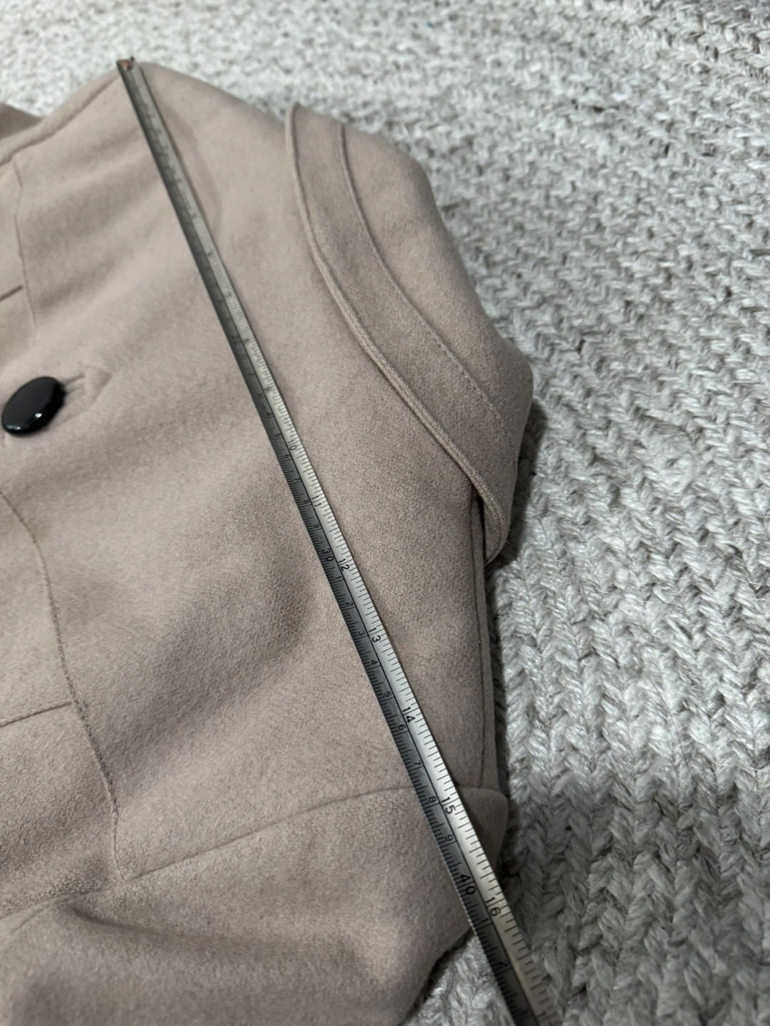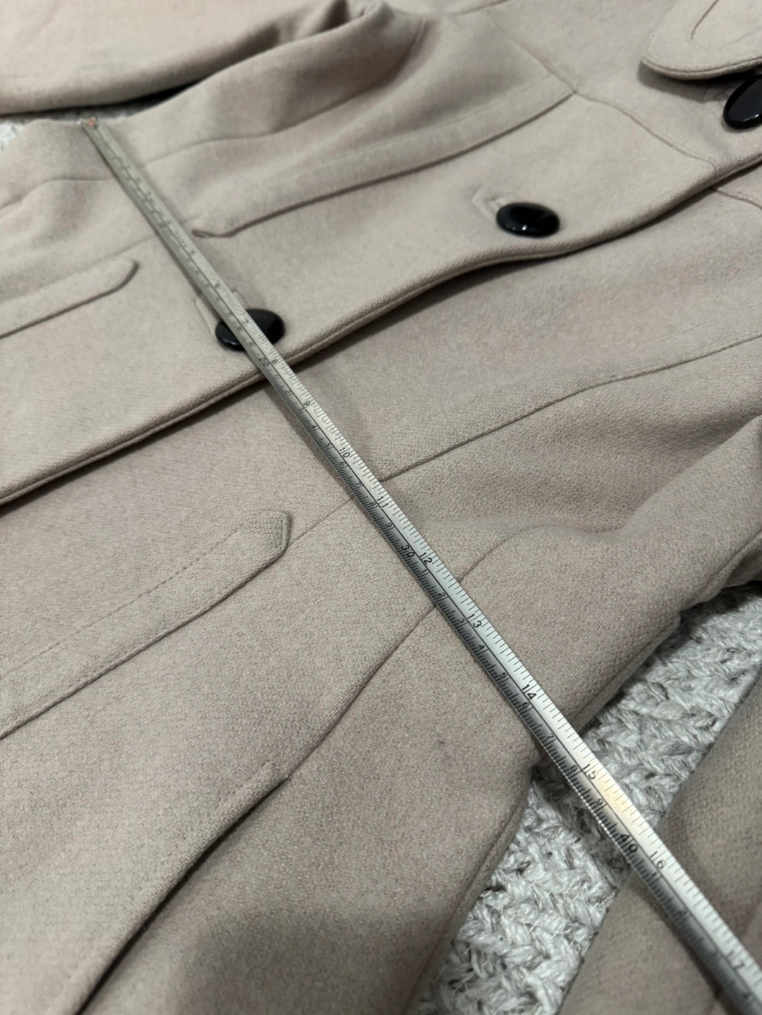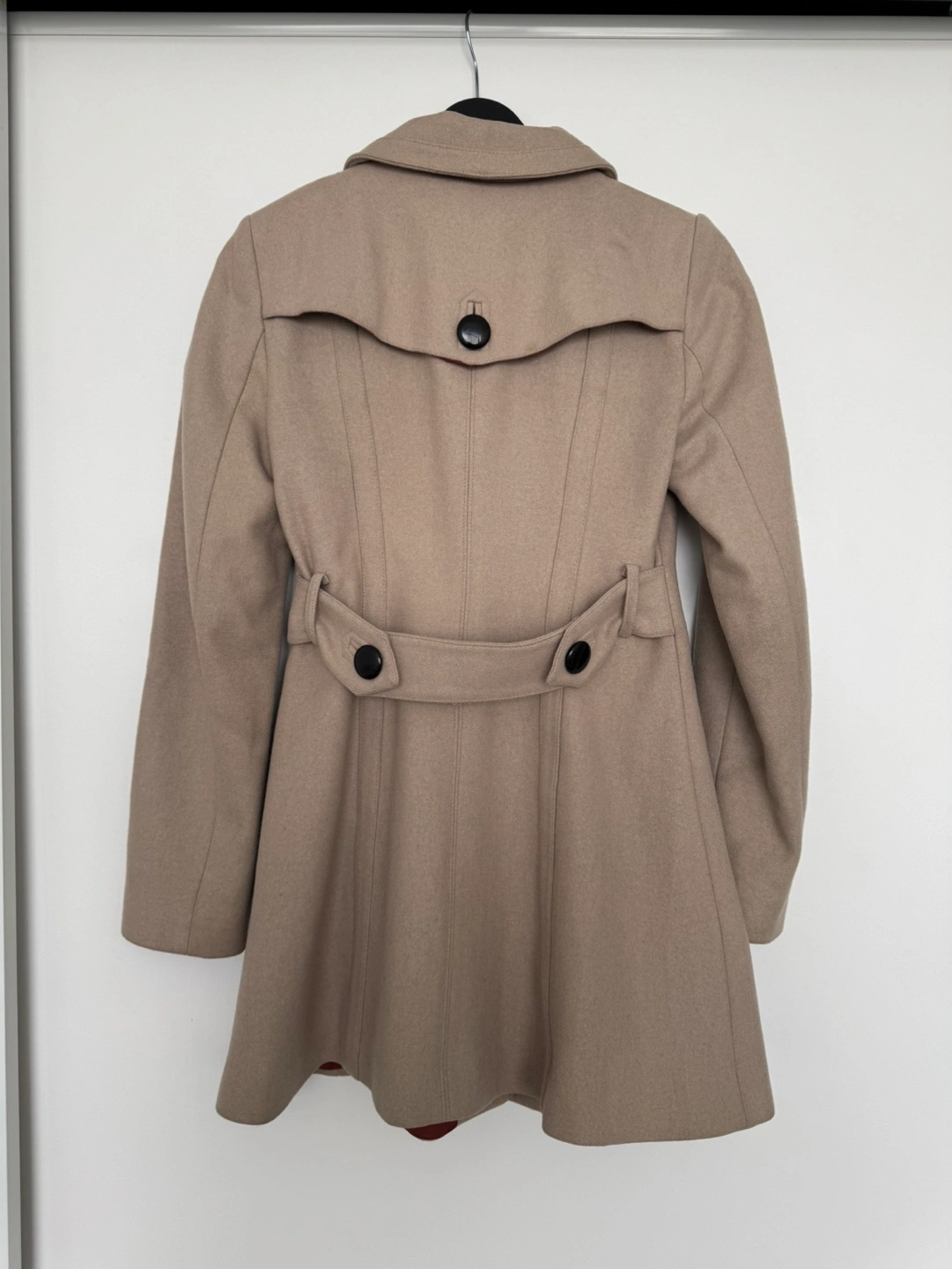 Women's beige peacoat. A-line fit. Features a Peter Pan collar, button closures, and long sleeves. Fully lined. See signs of wear in pictures with measurements