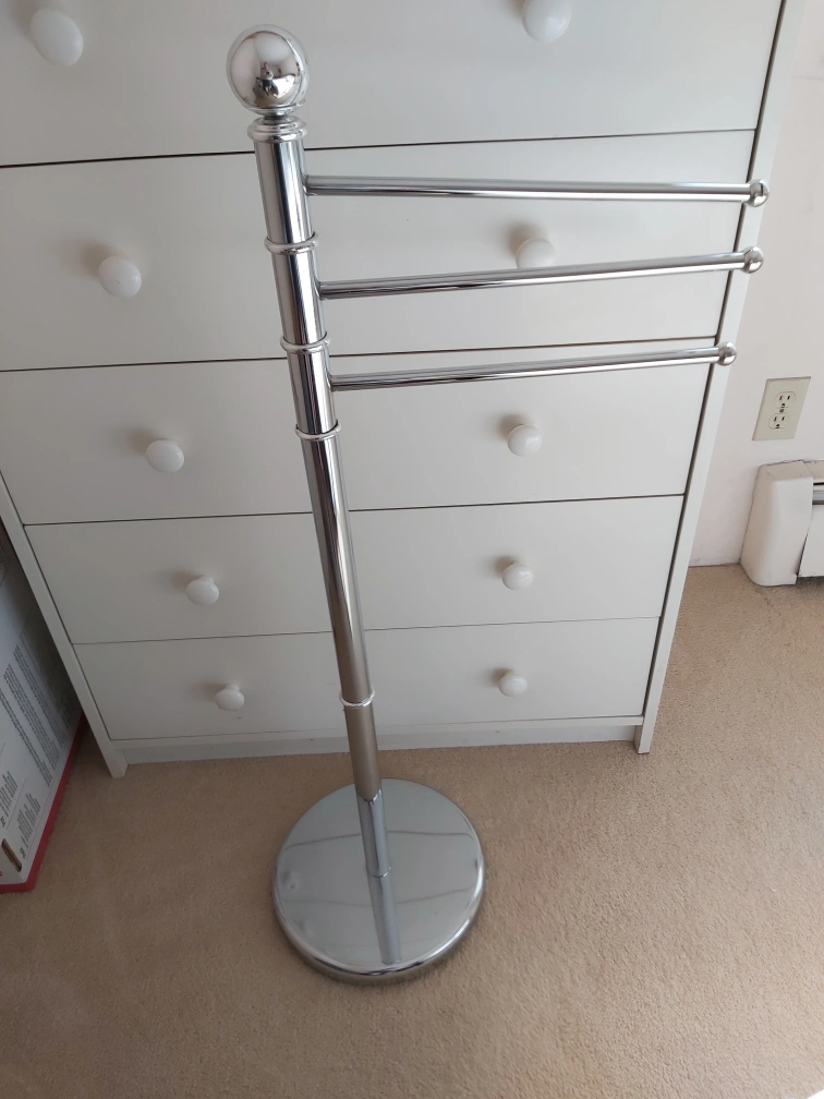 Three-tiered freestanding towel rack. Chrome finish. Round base. Ball finials. Cash please. ๐