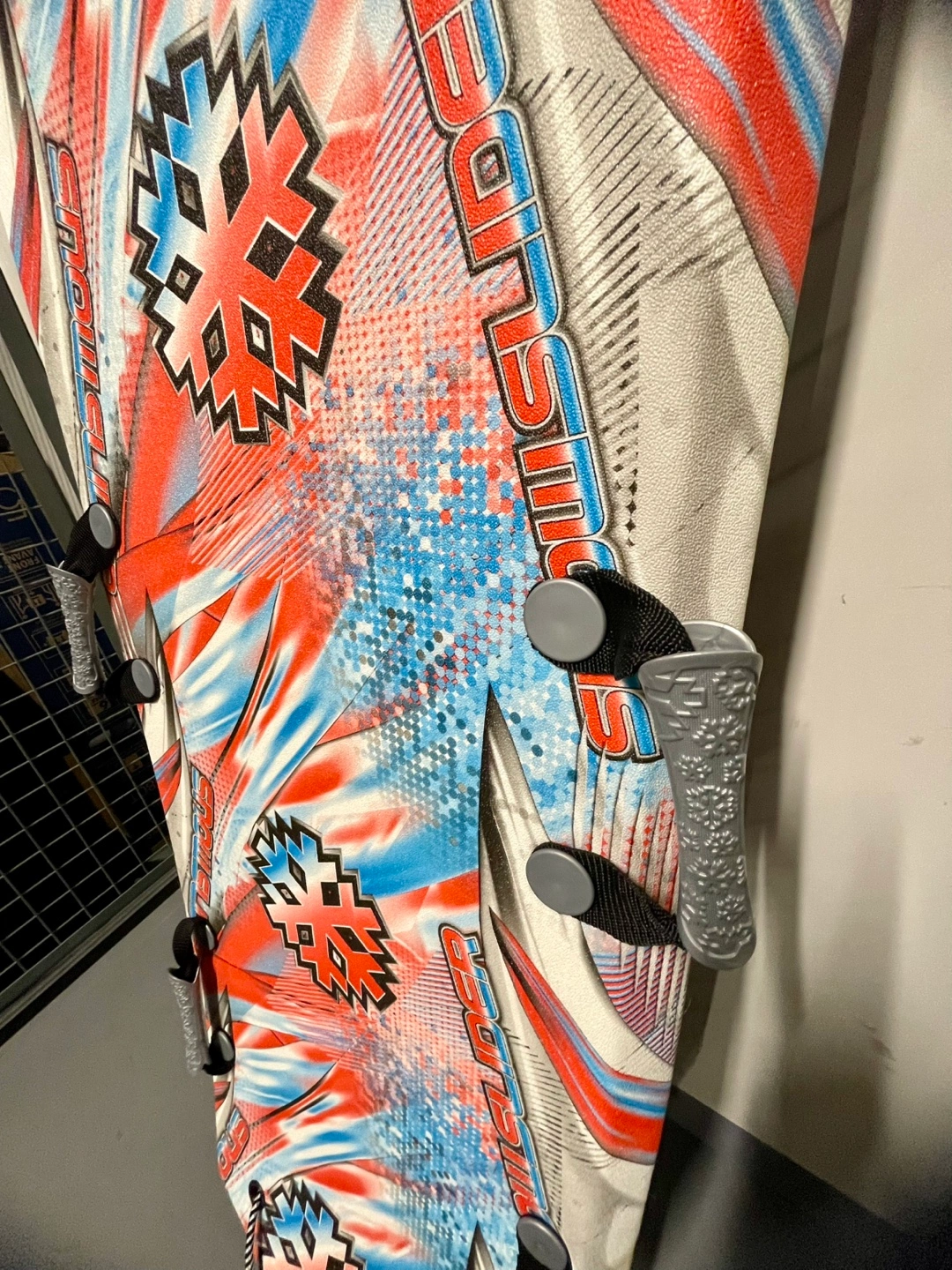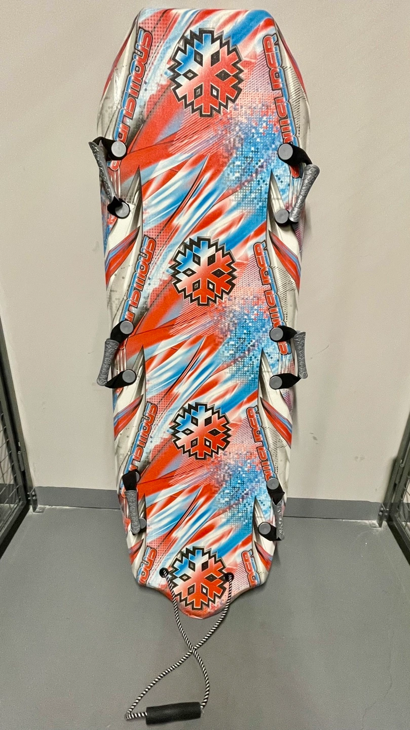 3 person snow sled. Red, white, and blue design. Multiple handles and tow rope attached. Sturdy and comfortable for all ages! About 160 cm / 5'4" length.