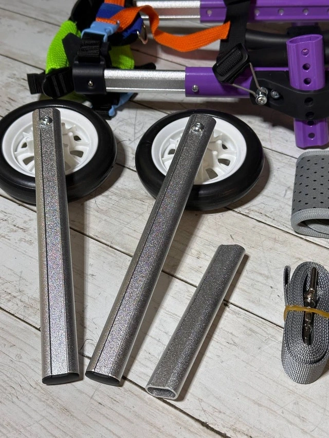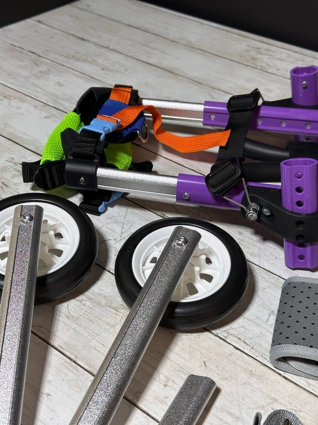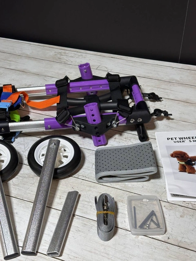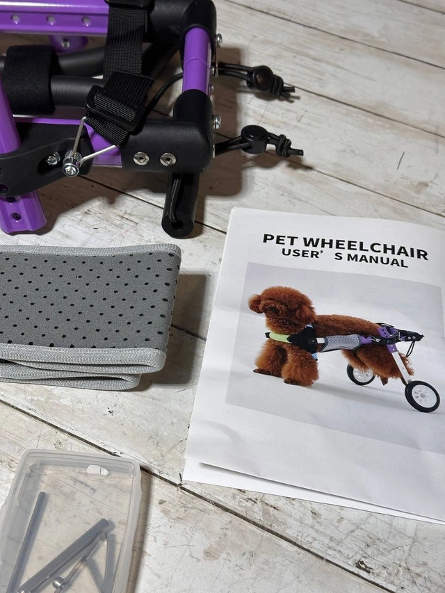 Designed for small disabled pets, this wheelchair provides hind leg support for injured or disabled pets, as well as cats and dogs with age-impaired mobility. With the help of wheelchairs, they can stay active and maintain a high-quality life. This wheelchair is made of lightweight aluminum alloy, which is resistant to wear, dirt, rust, durable and easy to carry. After wearing this wheelchair, pets can easily walk with it. The height, width and length of the pet wheelchair can be adjusted according to the pet's body without disassembly. This wheelchair adopts a buckle design, and the traction rope can be hung on the buckle to avoid losing the pet, which is very convenient.