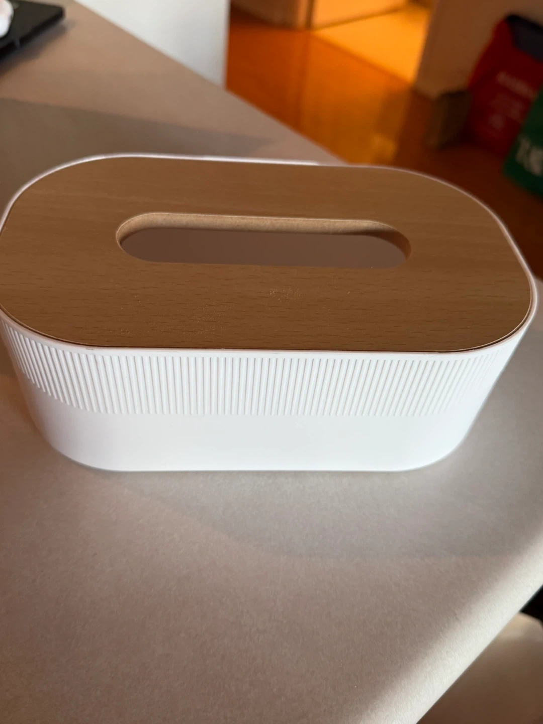 It's a tissue box with a white base and a wooden lid. The base has a ribbed texture around it. It's great for adding a touch of modern style to any room.