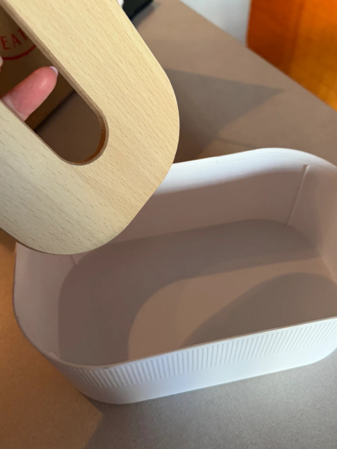 It's a tissue box with a white base and a wooden lid. The base has a ribbed texture around it. It's great for adding a touch of modern style to any room.