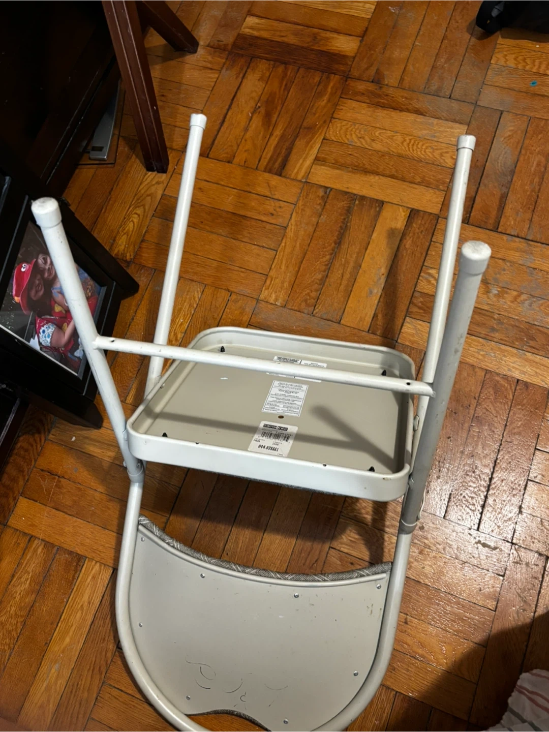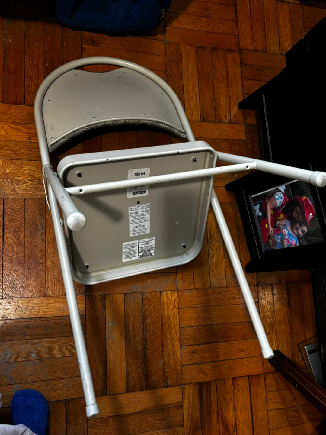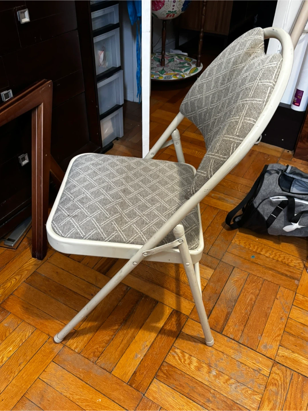 This is a folding chair with a gray upholstered seat and back. The frame is metal and it folds for easy storage. It's great for extra seating when guests come over!