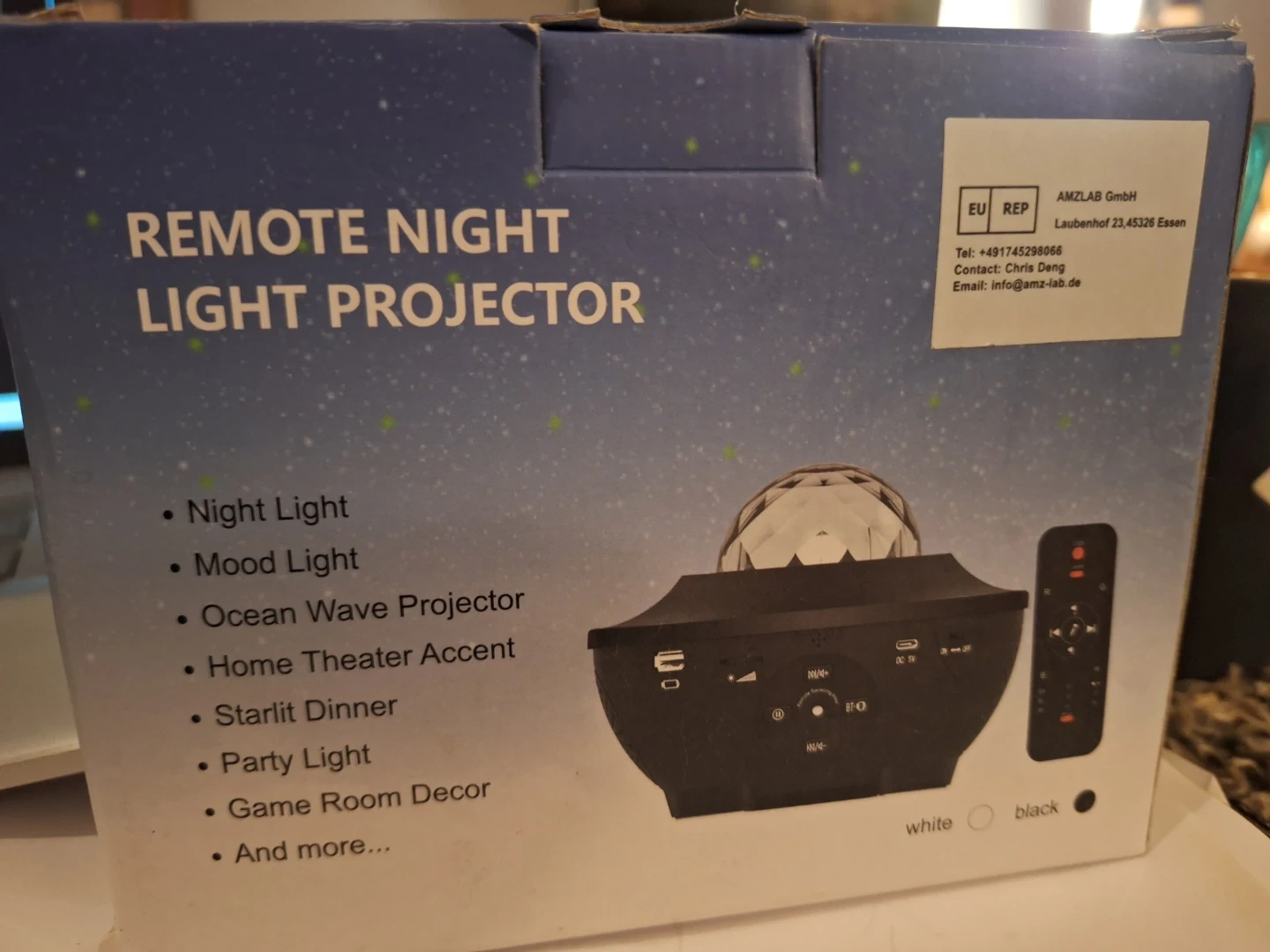 This is a remote night light projector with multiple settings like mood light and ocean wave projector. It includes a remote control and is powered by DC 5V. It's great for setting a mood for parties or just relaxing!