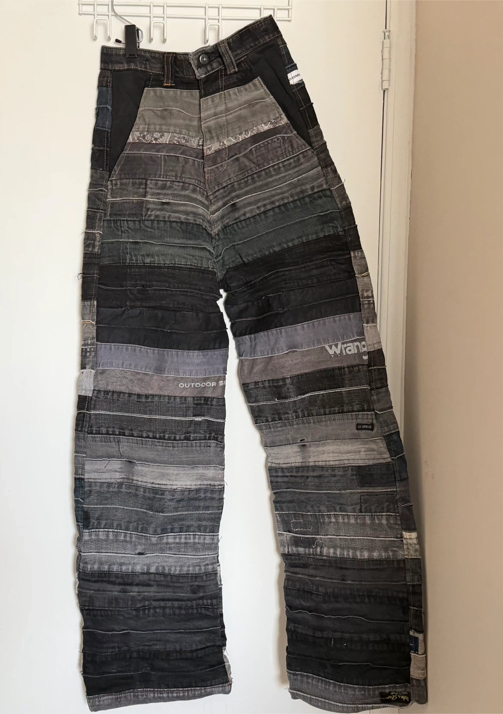 These handmade high rise jeans feature a unique patchwork design made from various denim washes. They're constructed with a stretch fit for comfort.