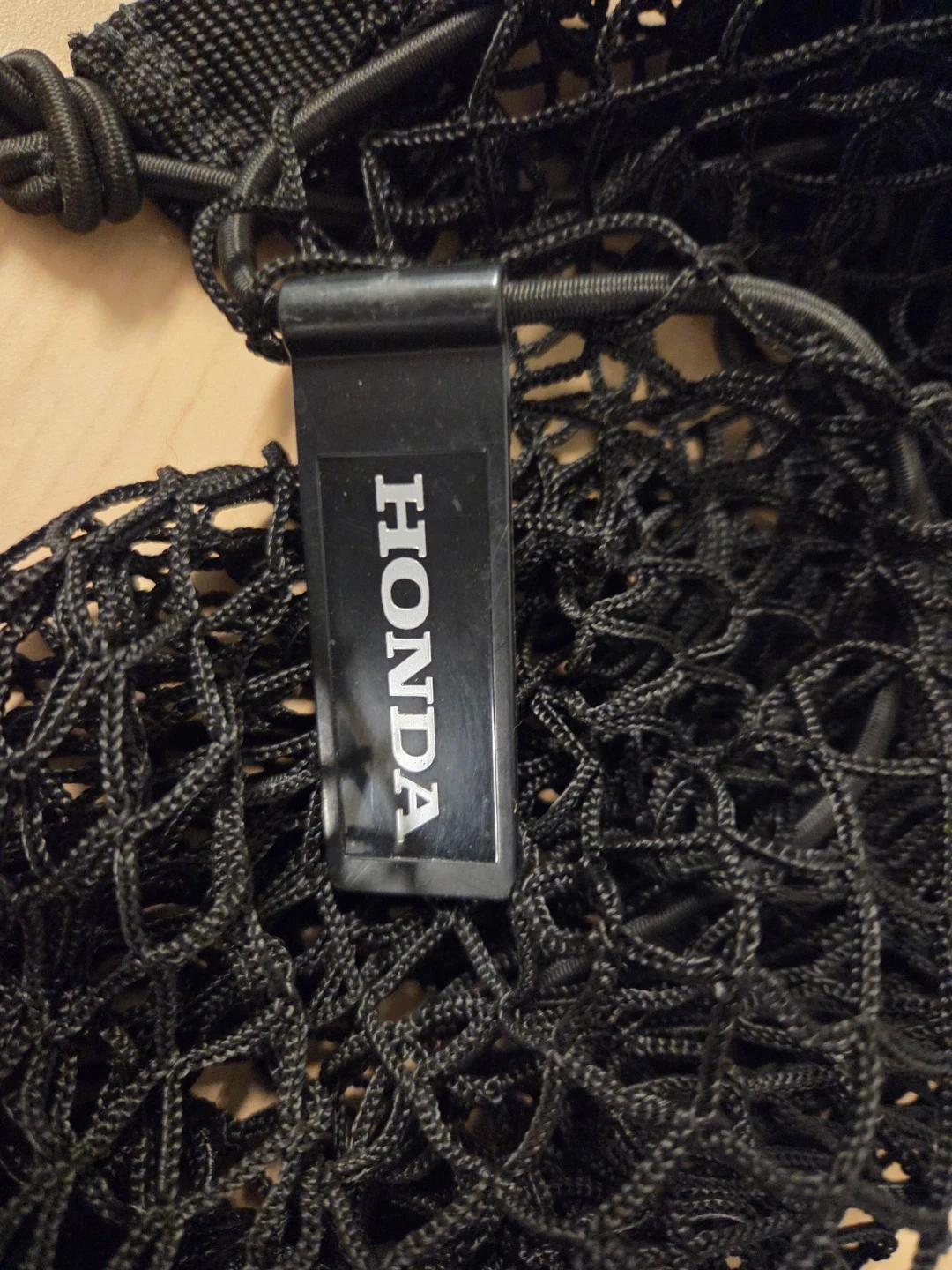 Black Honda cargo net for keeping items secure in your vehicle. It's made of durable mesh material with integrated straps. Great for groceries or sports gear!