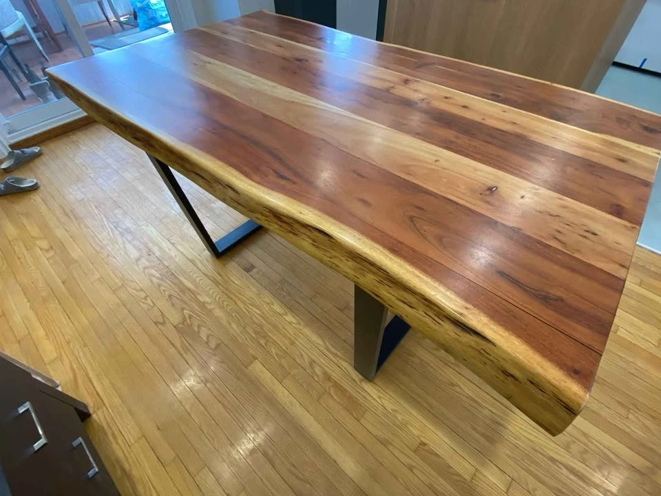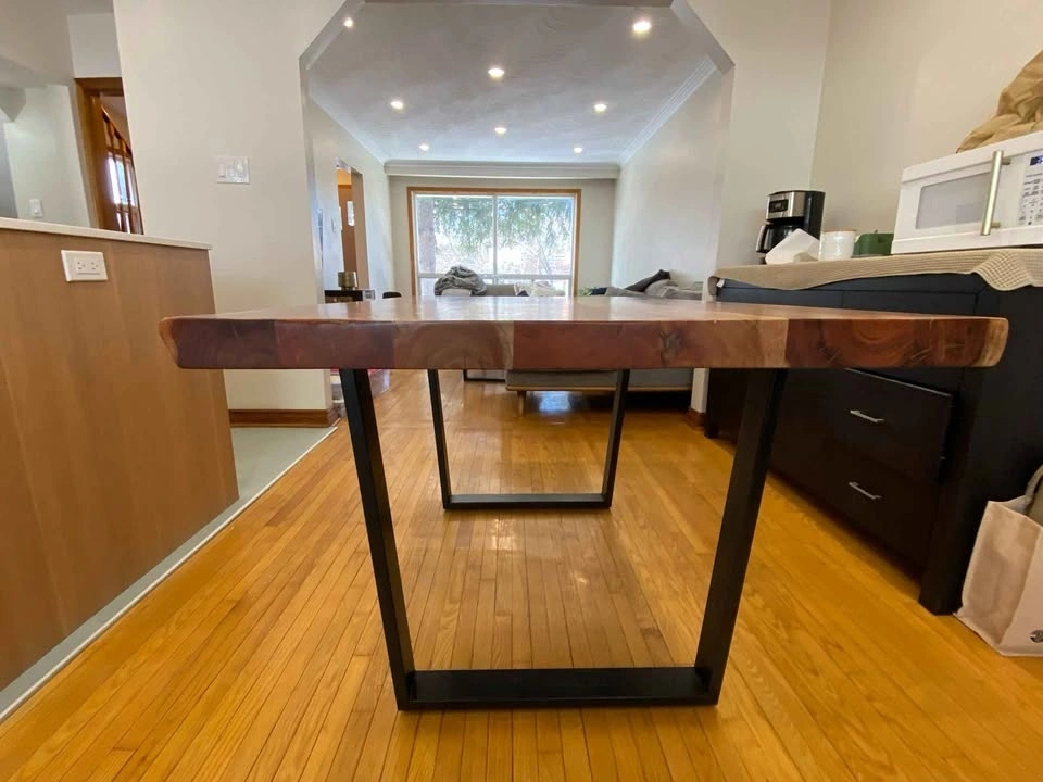 Wazo live edge dining table featuring solid, thick Acacia wood slab with natural, irregular edges and, black metal U-Shaped legs for a natural yet modern, industrial look. Dimensions: 59 Inches long by 35 inches (varies | live edge) wide by 30 inches high. Slab is 2 inches thick. 2 Bench: Wazo live edge dining table Bench featuring solid, thick Acacia wood slab with natural, irregular edges and, black metal U-Shaped legs. 57 Inches long by 15 inches (varies | live edge) wide by 18 inches high. Slab is 2.5 inches thick. Table $1000. Benches $350 each. Or everything (table and 2 benches) for $1350.